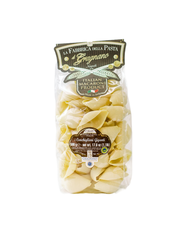 Evoking the summer sea with its large shell shapes, Conchiglioni Grandi pasta is perfect with a homemade sauce, or for baked pasta dishes. La Fabbrica della Pasta has been making pasta for three generations in Gragnano, a small town nestled in the hills near Naples, famous for its pasta production for over 500 years. Pasta from Gragnano is very special: made with local spring water and high-protein Durum wheat which helps keep the pasta al dente, then extruded through a bronze die, giving the pasta a porous texture that helps it bind with sauce, and dried slowly at a low temperature.