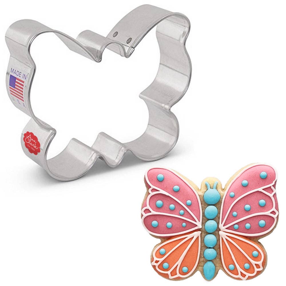 Butterfly Cookie Cutter, 3 1/8". At Ann Clark, America's leading cookie cutter manufacturer, we know cookie cutters and the bakers who use them. Made of USA steel, each cookie cutter boasts the rigidity and precision edges required to cut through cookie dough and soft foods, and to last for generations. We test our products yearly to ensure that they are food safe. The techniques we have developed over three decades of manufacturing have set us apart, permitting us to create modern, complex shapes with crisp corners and intricate details.
