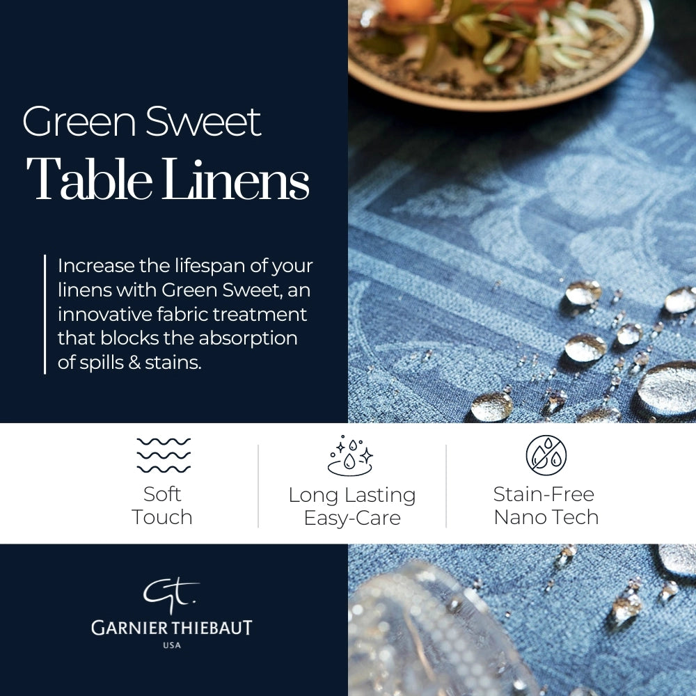 Green Sweet: Discover our revolutionary Green Sweet stain resistant treatment. This patented eco-friendly treatment protects your linens against spill and stains, without altering the look and feel of linens. Enjoy the look and soft feel of cotton linens, without worrying about stains.