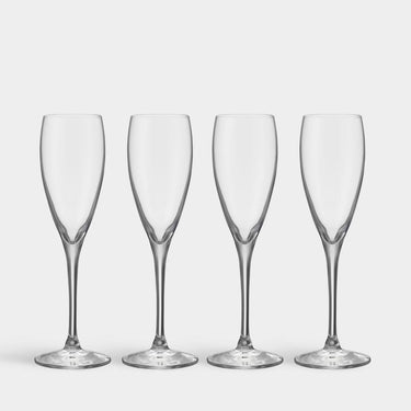More Champagne from Orrefors, available as a set of 4, holds 5 oz and is an elegant, festive glass for sparkling wines of all kinds. This glass accentuates the aromas and flavors of the drink, its crispness, and its fruitiness. The bubble point at the bottom of the glass helps the carbon dioxide in the drink rise to the surface, and the long, narrow shape preserves the bubbles. Designed by Erika Lagerbielke.
