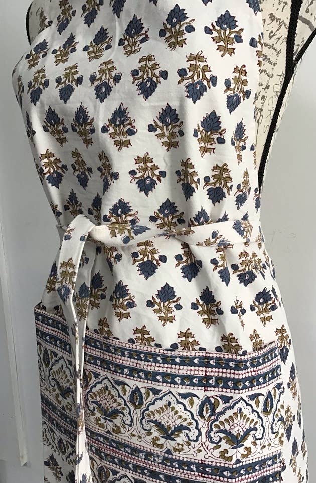 Hand block printed cotton canvas apron. Button hole neck strap adjustment. Size: One size Machine wash.