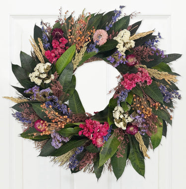 Using multiple types of delicate dried flowers and lush green leaves, we made this delightful Newport Wreath that fits perfectly with any decor. - 18" diameter - Each wreath comes in a wooden crate for storage & display - Please note that our wreaths are handmade of natural materials that can be damaged if exposed to rain, snow, or heavy wind. We recommend keeping our wreaths inside or on a covered porch to protect the wreath.