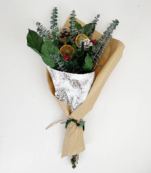 Our floral team designed this festive winter bouquet of preserved baby eucalyptus, snowy pinecones, artificial red berries, and orange slices wrapped in kraft and festive patterned pinecone print papers, to create this lush and celebratory winter arrangement.