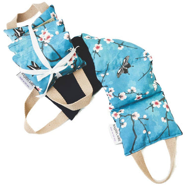 Filled with naturally cleaned cherry stones, this therapeutic pillow is wrapped in a teal cherry blossom cotton fabric and backed with cozy navy corduroy. Natural fiber handles are sewn into the ends for ease of use. Suitable for hot and cold treatment anywhere on the body to release tension and soothe muscle aches. Cherry stones hold their temperature longer than other natural fillers and produce a relaxing "rain stick" sound when handled. Each handmade cherry stone pillow measures 5.5" x 20"