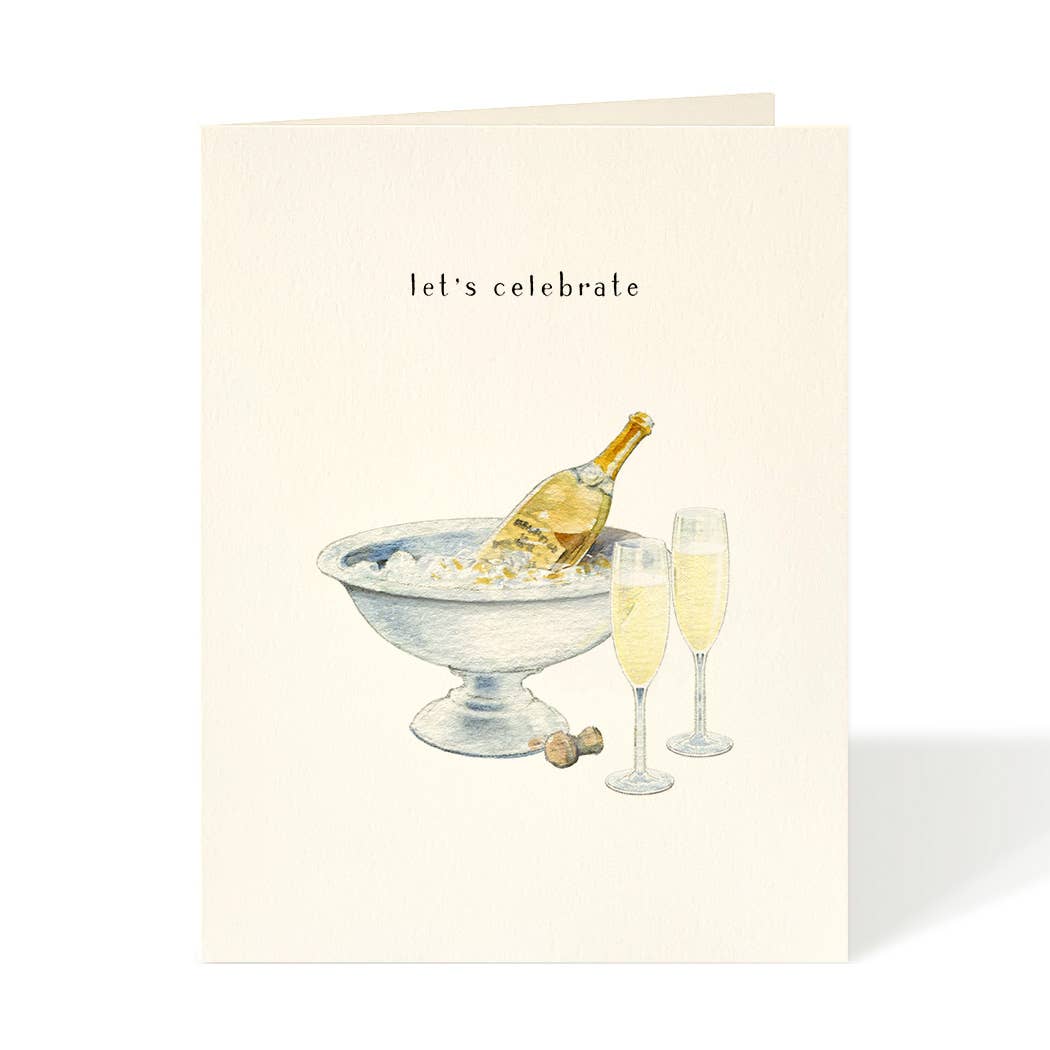 Printed on a beautiful stock, our greeting cards feature Felix's watercolor drawings, his handwritten font, and witty sayings that are positively charming. The quality envelope is the finishing touch. This card with it's champagne glasses and bucket rings in the New Year and any occasion where champagne is welcome. Perfect for sending New Year's greeting cards. 4.25 x 5.5 inches folded. Ultra-premium, lightly-textured acid-free paper stock. Packaged in a cello sleeve. Handmade in the USA. Front: let's celebrate.