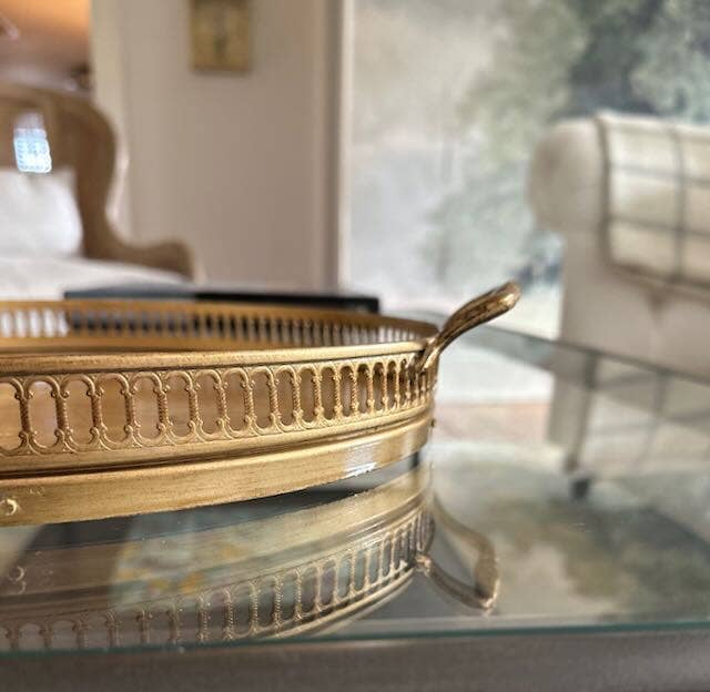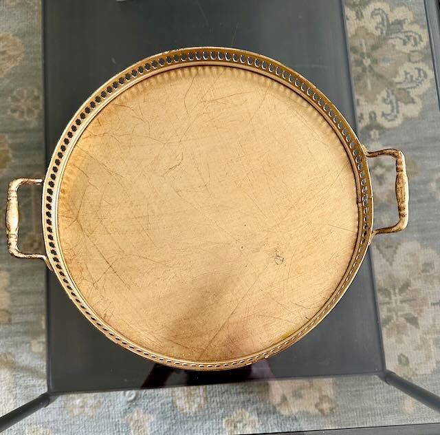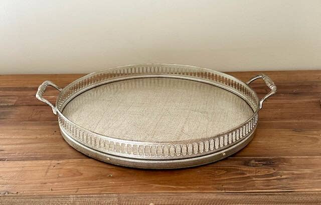 Gorgeous round metal and wood tray, hand-finished in either gold and silver. Use for serving or as a display piece for a stunning addition to any room.