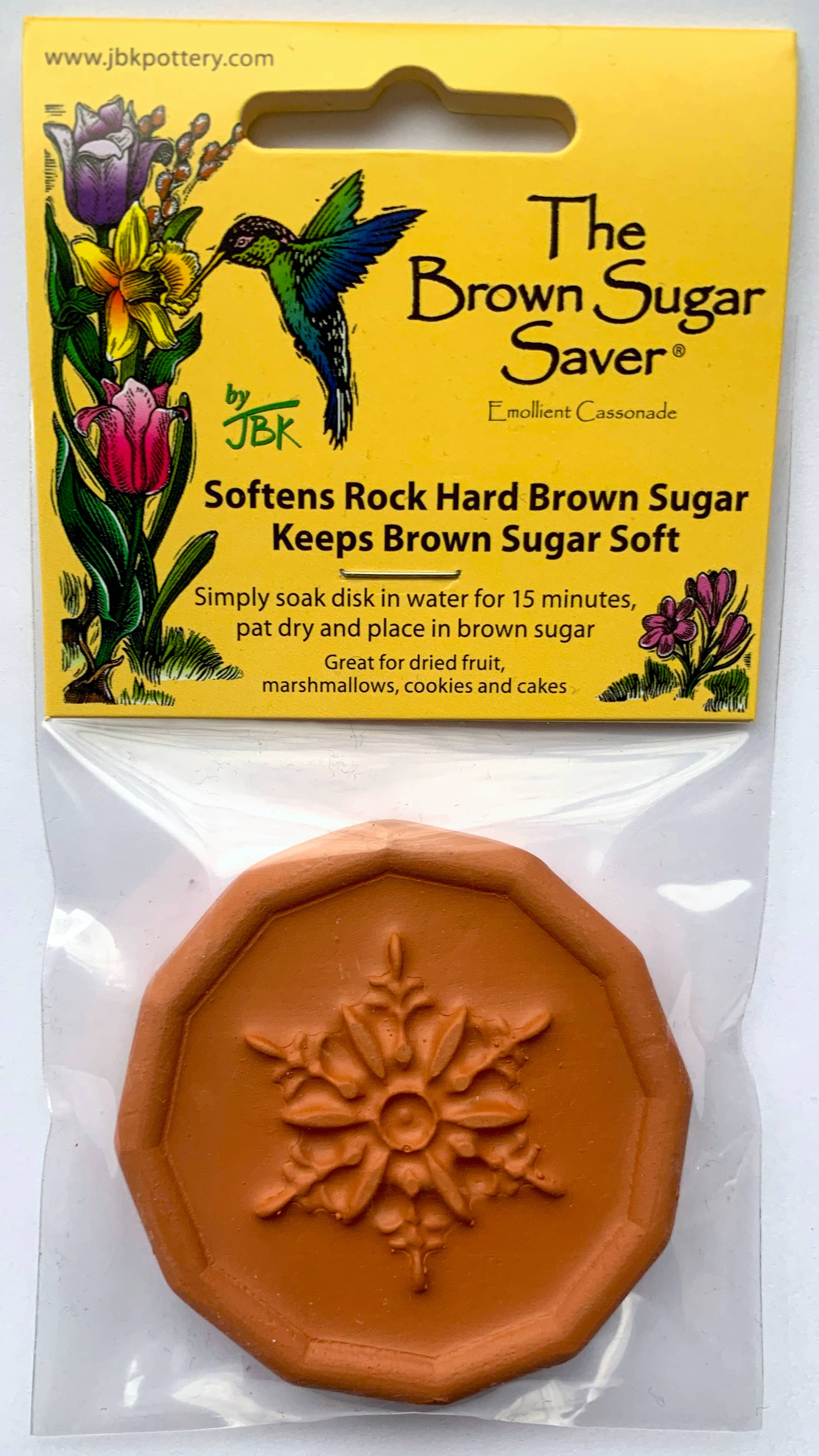 Soak your ceramic Brown Sugar Saver in water for 15 minutes, pat dry, and tuck it in the brown sugar. When kept in a sealed container, this will keep brown sugar soft for up to 3 months. When sugar begins to harden, re-soak, pat dry and use again.