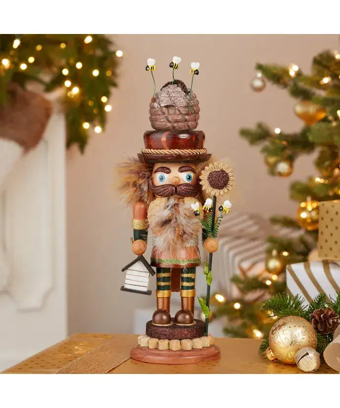 This 15-inch Hollywood™ bee keeper nutcracker is a fun, festive way to add to your holiday décor or nutcracker collection! Designed by renowned artist Holly Adler, Hollywood™ Nutcrackers is a whimsical collection of nutcrackers created exclusively for Kurt S. Adler, Inc. and features an assortment of designs including Christmas, fantasy and everyday nutcrackers. It features a yellow and black glittered color scheme with a beehive hat adorned with honey bees. In one hand he is holding a miniature beehive and in the other hand he is holding a glittered sunflower staff with honey bees.