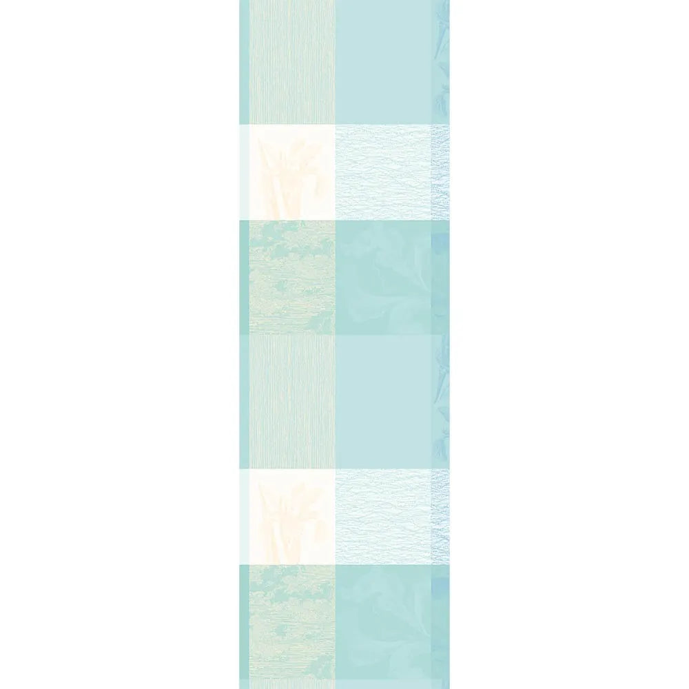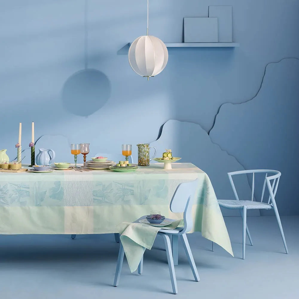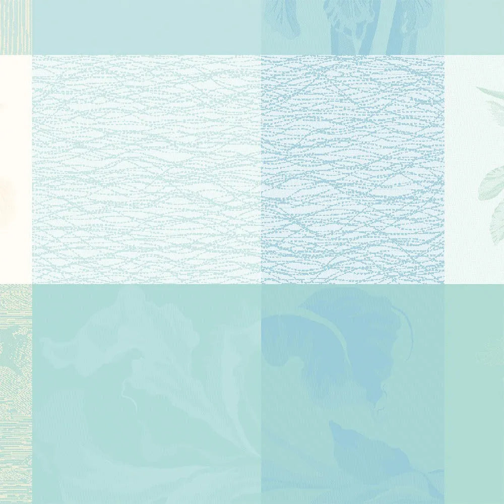The Mille Iris D Eau Aqua Jacquard Tablecloth features calming blue tones woven into an intricate madras plaid enriched with iris and flowing water motifs. Crafted from cotton jacquard for lasting softness and depth, it brings a tranquil, water-inspired elegance to the table.