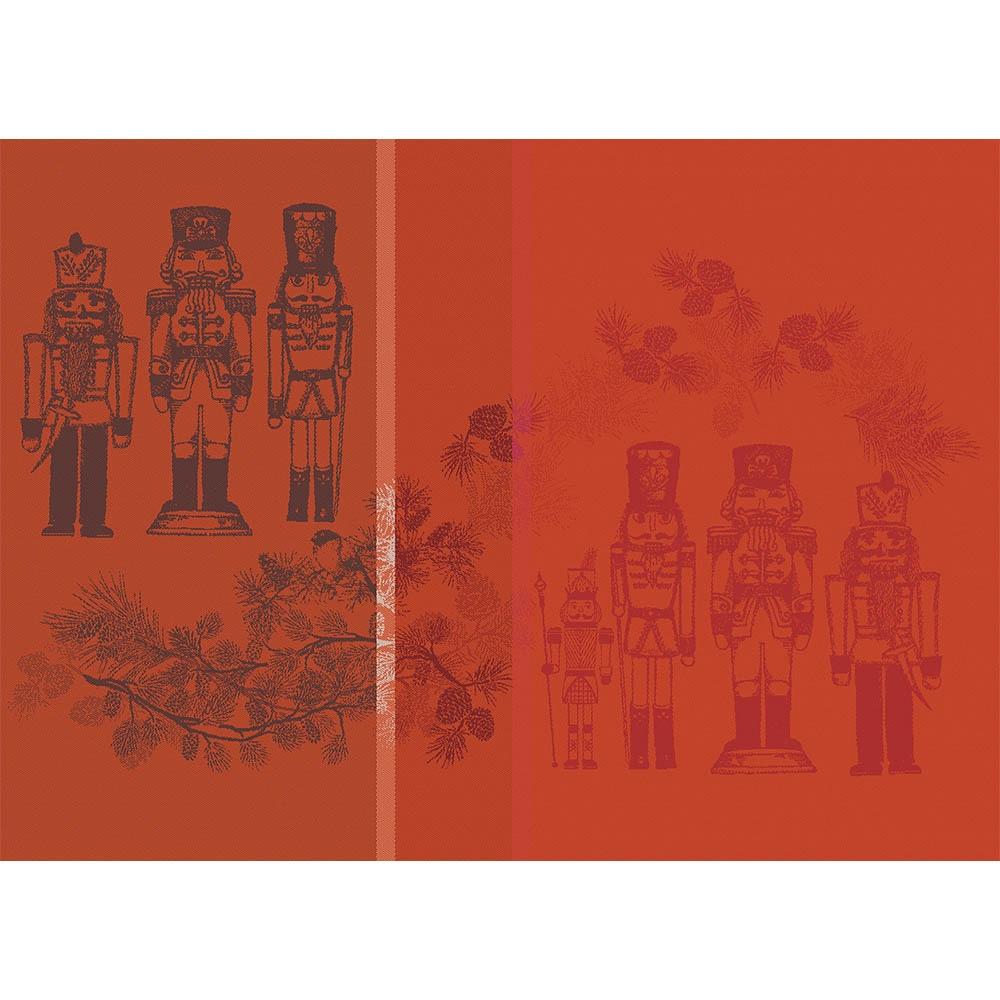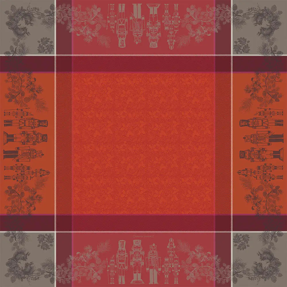 Featuring a festive red jacquard weave with a detailed border of nutcrackers and holly in black and white, each thread is artfully layered to bring depth, charm, and holiday warmth to the table. A refined yet joyful choice for seasonal gatherings, it captures the spirit of a classic French Christmas.