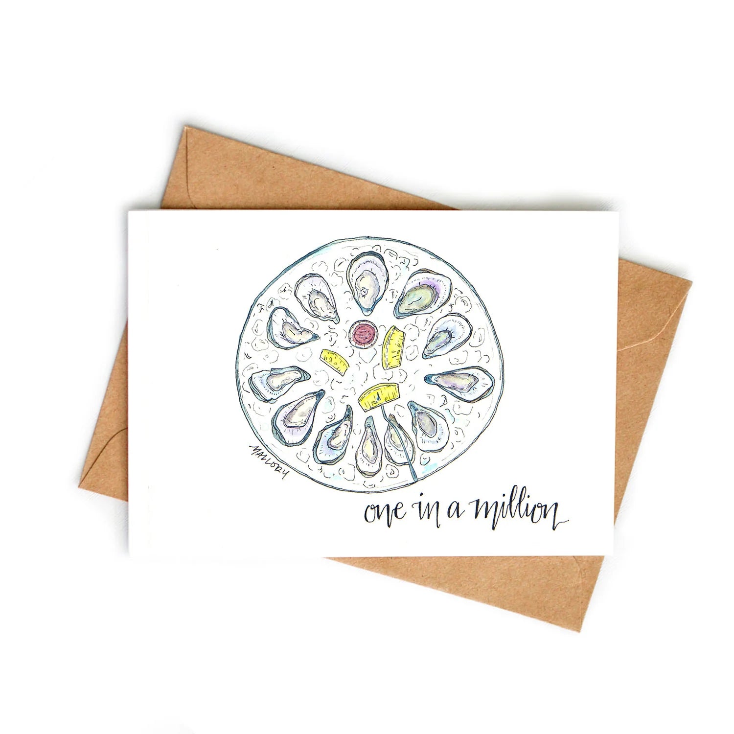 What are the chances of finding a pearl in your oysters by the half shell? One in a million! This sweet card is to show your loved ones how unique and special they are. Perfect for any time. Originally hand-illustrated and painted.