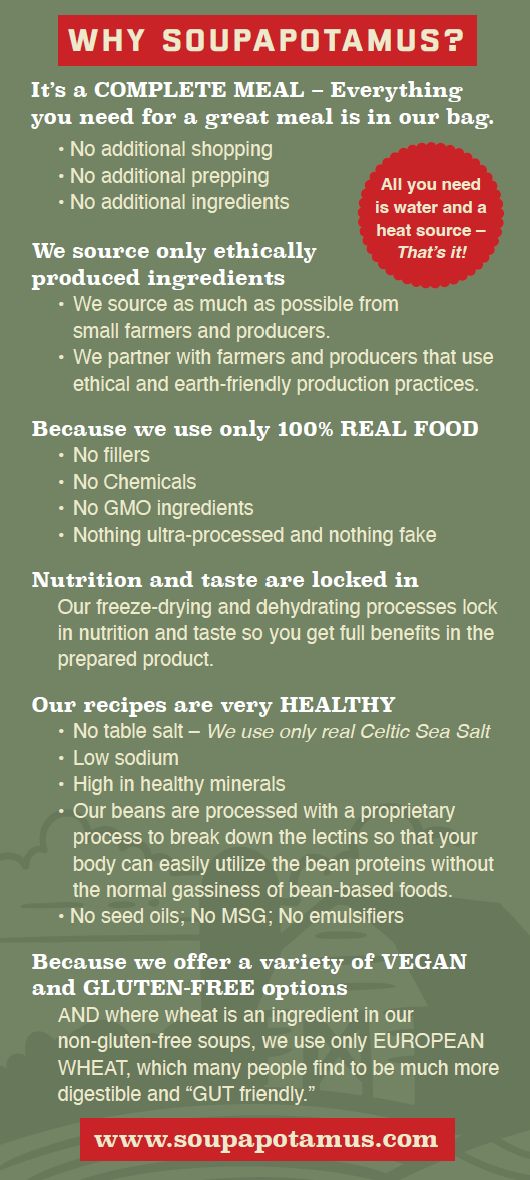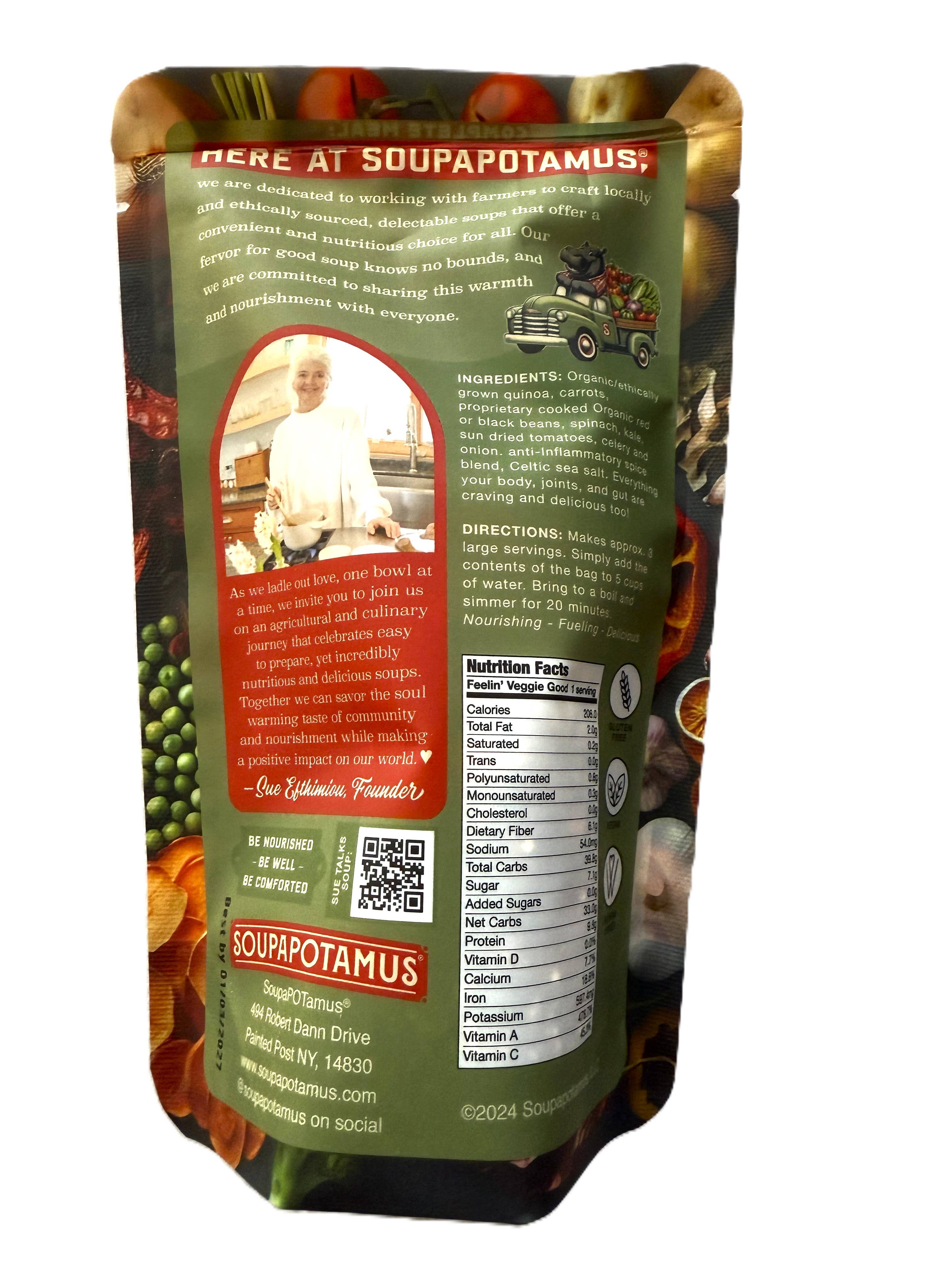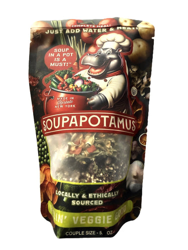 Soupapotamus Feelin' Veggie Good Dehydrated Soup is a vibrant, plant-based meal packed with delicious vegetables and savory spices. This vegan and gluten-free soup is perfect for quick, easy, and nourishing meals at home or on the go.