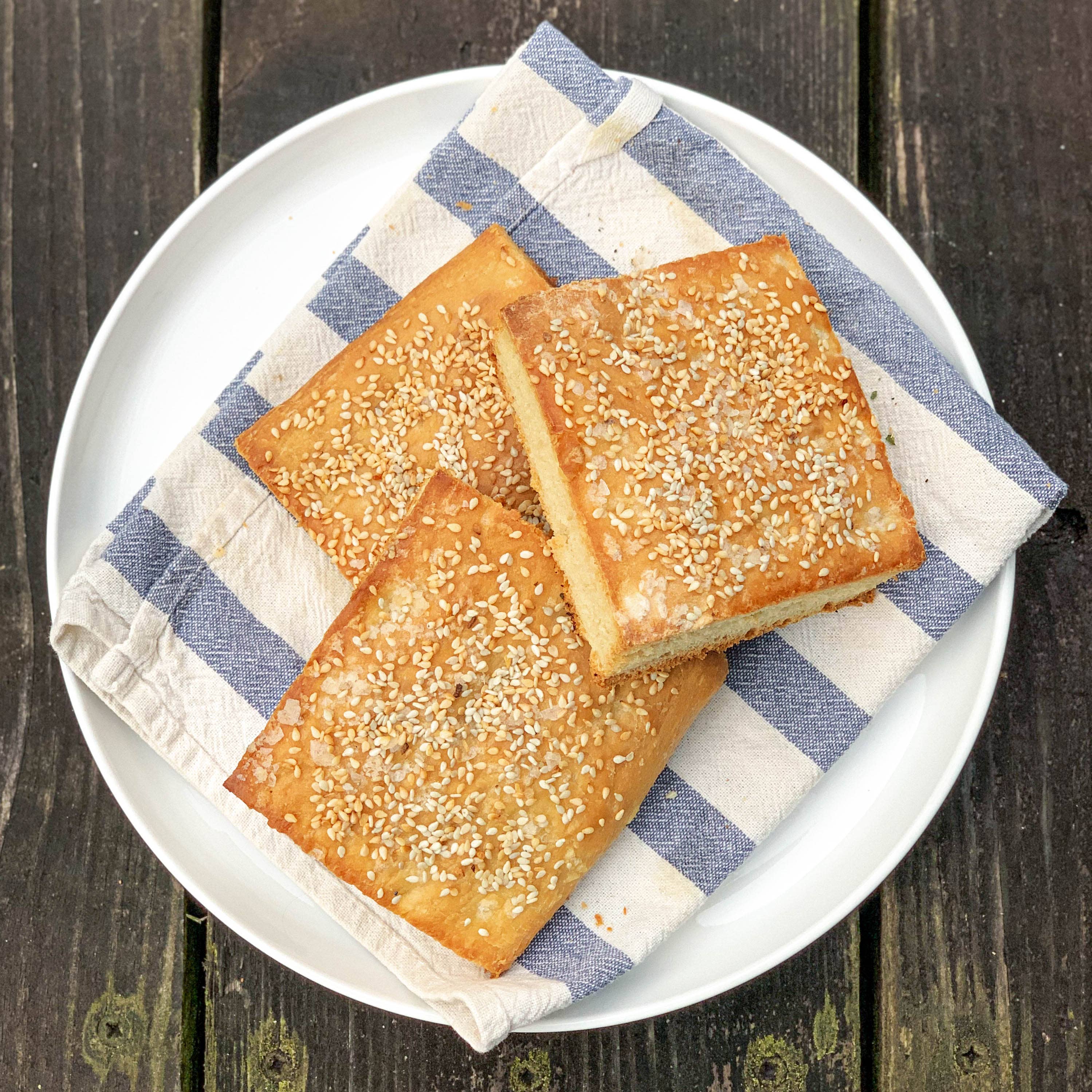Introducing your new favorite sandwich bread: sesame crusted focaccia. Focaccia checks all our bread boxes: crispy on the outside, soft and chewy on the inside, and it works perfectly for both sopping up sauce or sliced through horizontally for sandwiches.