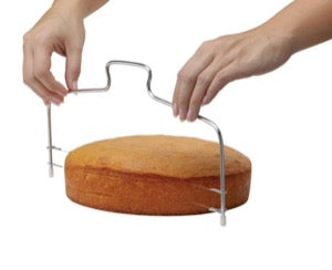 - Simple to use; adjust wires to the same height on each side, gently pull through the cake to slice layers, and remove and level the top dome