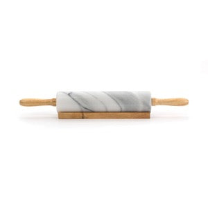 It comes with a wooden slab stand to easily keep this rolling pin on display and from rolling around the counter. This marble rolling pin has a grey, polished finish with wooden handles. The polished finished is designed specifically for keeping dough cool while you work.