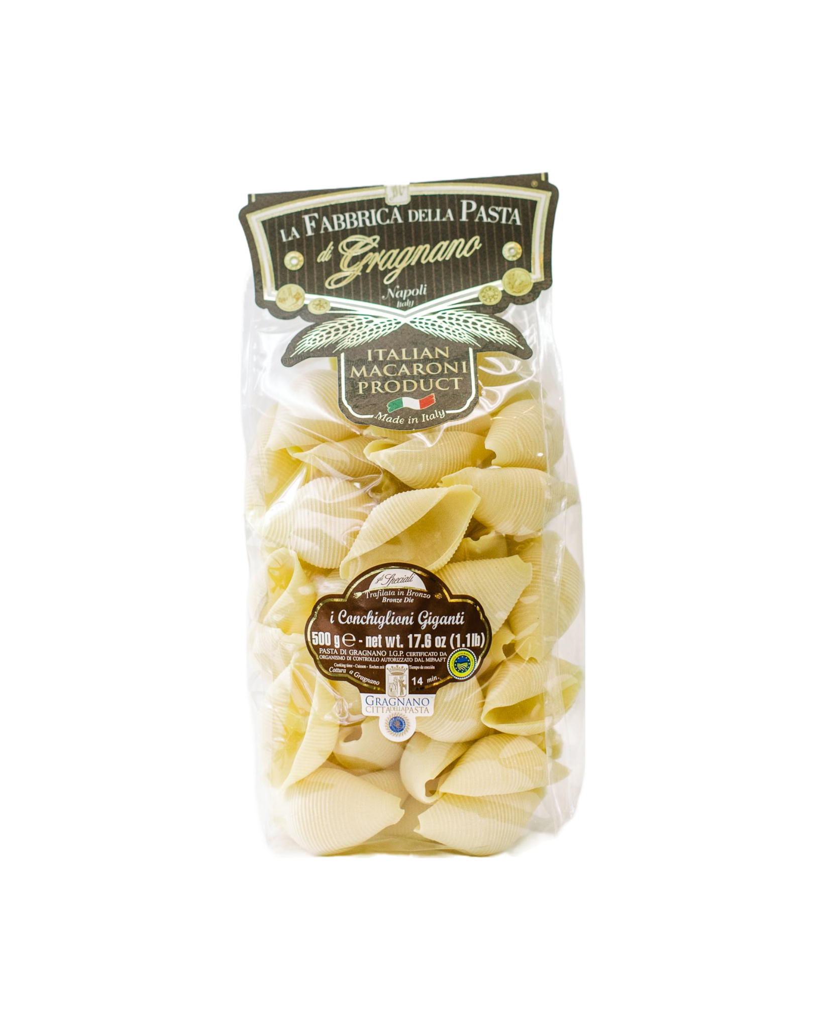 Evoking the summer sea with its large shell shapes, Conchiglioni Grandi pasta is perfect with a homemade sauce, or for baked pasta dishes. La Fabbrica della Pasta has been making pasta for three generations in Gragnano, a small town nestled in the hills near Naples, famous for its pasta production for over 500 years. Pasta from Gragnano is very special: made with local spring water and high-protein Durum wheat which helps keep the pasta al dente, then extruded through a bronze die, giving the pasta a porous texture that helps it bind with sauce, and dried slowly at a low temperature.