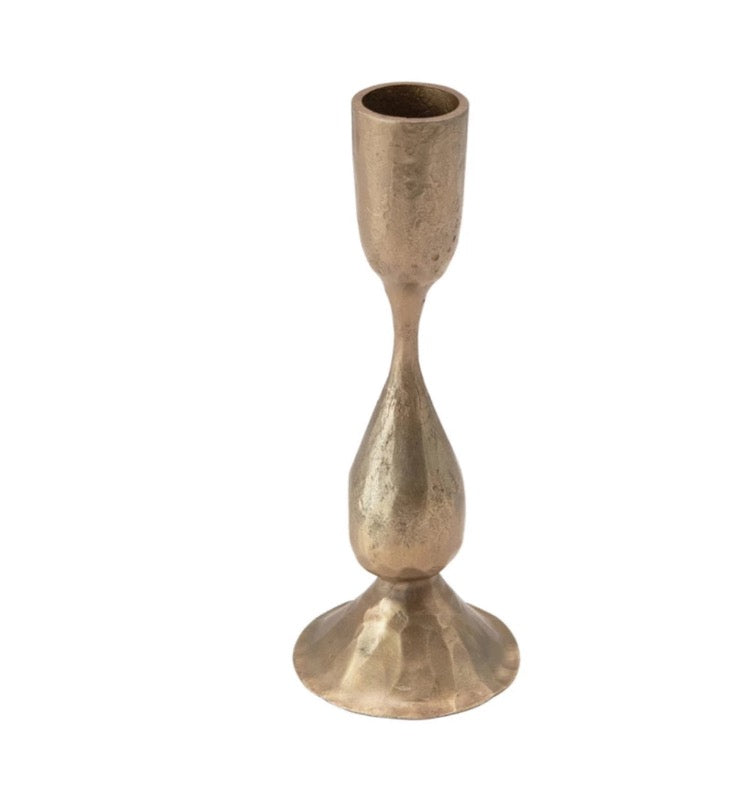 Stylishly designed, this hand-forged, metal taper candle holder has an antique brass finish. An imperfect texture gives it a unique appearance. Display with similar complementary pieces or as a stand-alone piece.