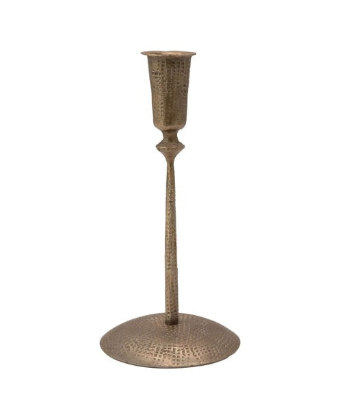 This 8.75" Metal Taper Holder Antique Brass showcases a textural finish to blend with multiple decoration styles. Its hand-forged hammered metal construction is sturdily designed and showcases intricately detailed impressions. It has an antique brass finish, and looks great when paired with complementary pieces or used with varying candle holders for a unique look.