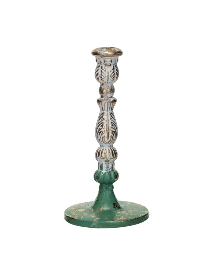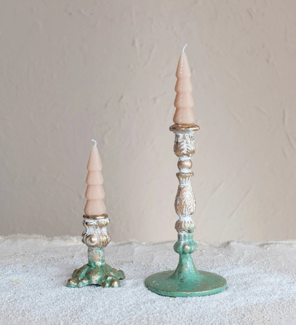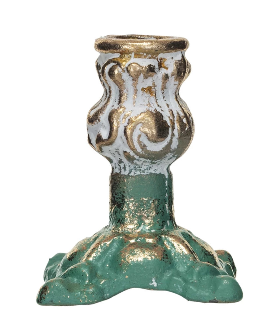 Cast Iron Taper Holder, Distressed Finish, Green, Gold & Cream, Two Sizes