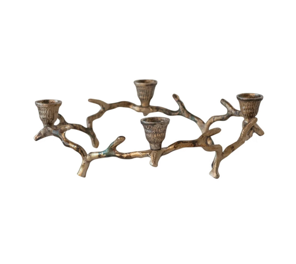 Blending tradition with elegance, this antique gold candle holder is the perfect centerpiece for your winter celebrations. This holder has a twig motif and has four receptacles for candlesticks.