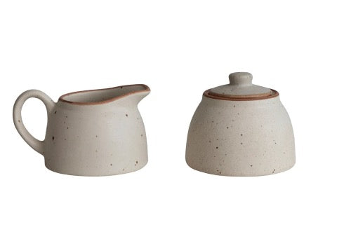 This sleek set offers classic Scandinavian minimalism in a modern form: a gently-textured cream backdrop sprinkled with organic brown speckles. The set includes a sugar bowl with lid, and a creamer pitcher which may alternatively be used as a dressing or gravy pitcher.