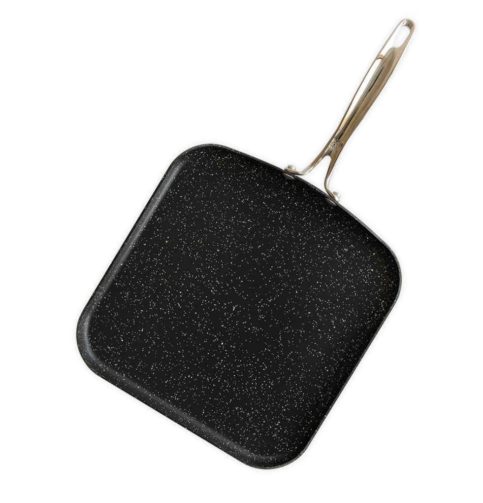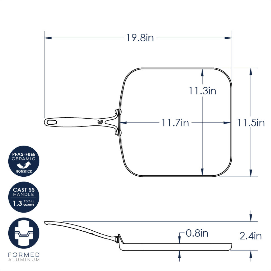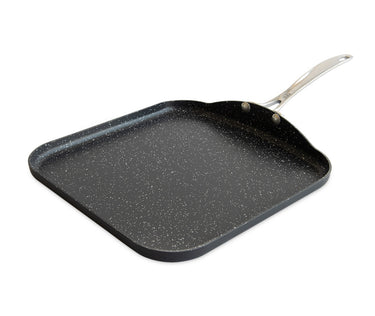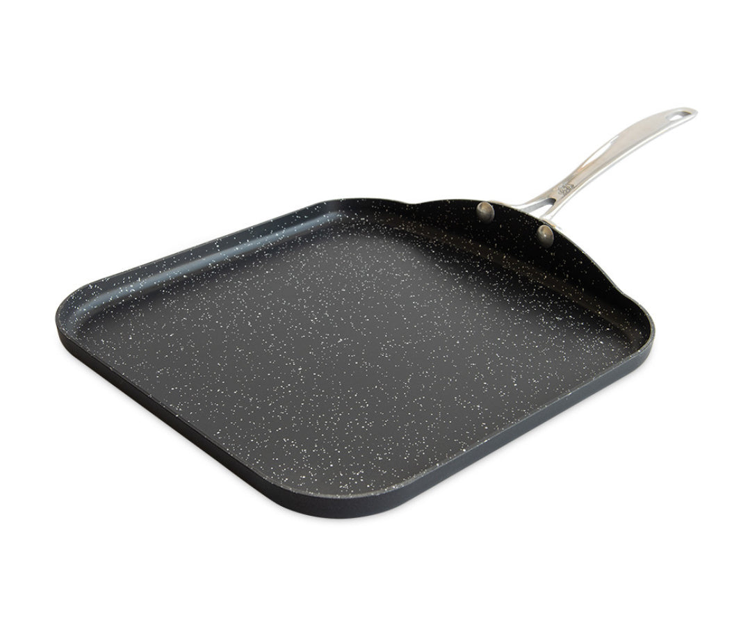 Our 11-inch Square Stovetop Griddle Pan is included in our newest ceramic coated cookware line, Basalt. The perfect addition to your kitchen for a versatile and convenient cooking experience. Made of even-heating aluminum, the Basalt 11-inch Griddle Pan can handle cooking pancakes, bacon, and many other foods on any glass, electric or gas stovetops. Cleaning is also a breeze as the ceramic nonstick surface ensures quick release. In addition to its stovetop versatility, this Griddle Pan is oven-safe, giving you the flexibility to finish cooking meals in the oven or keeping them warm as you finish cooking on the stove.