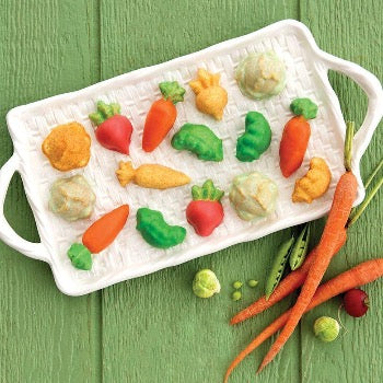 Bake a bushel of bite-size veggies using your favorite batter. Makes 20 adorable cakelets shaped like carrots, radishes, pea pods, and cabbages. Perfect treat for springtime festivities!