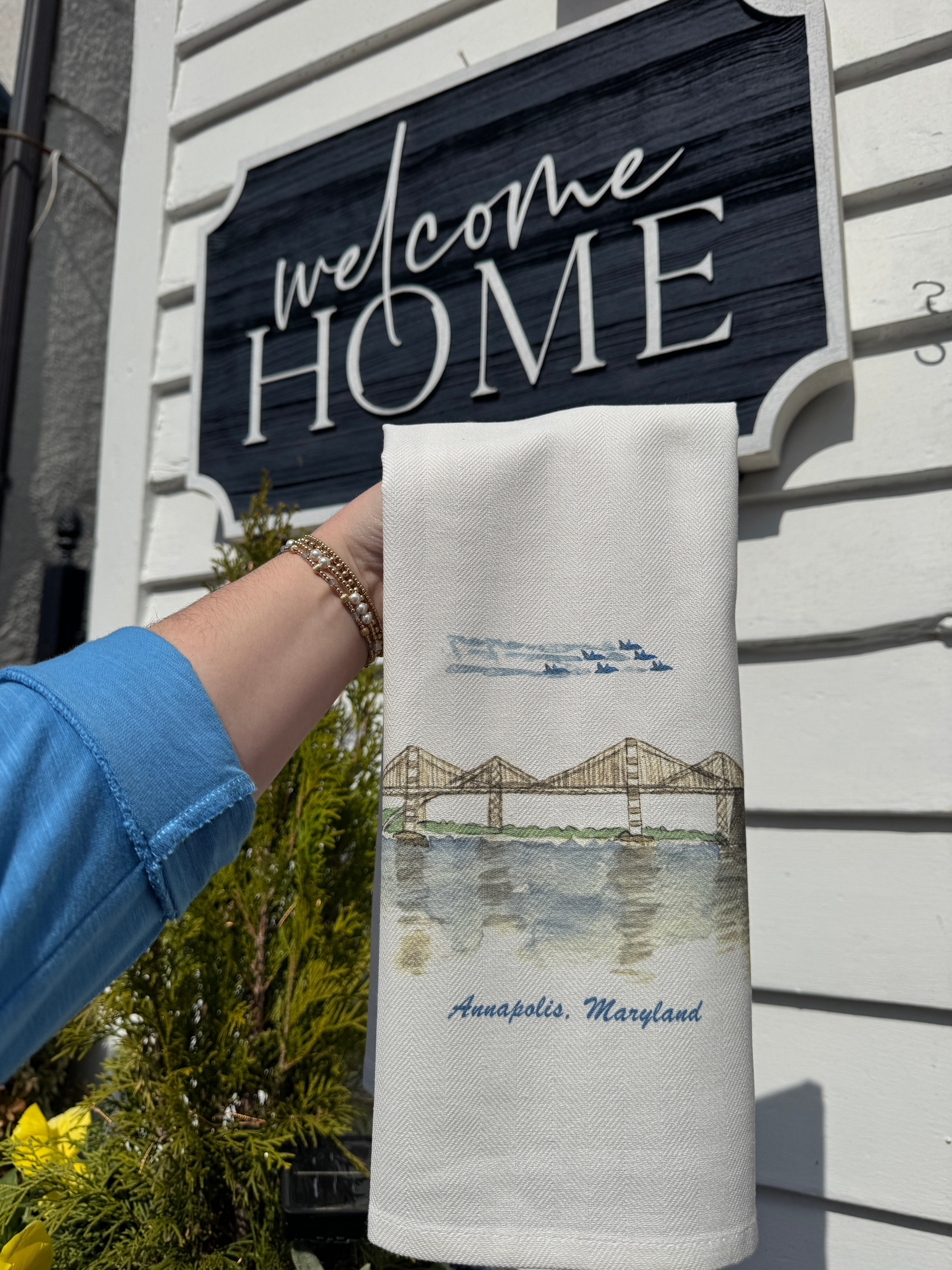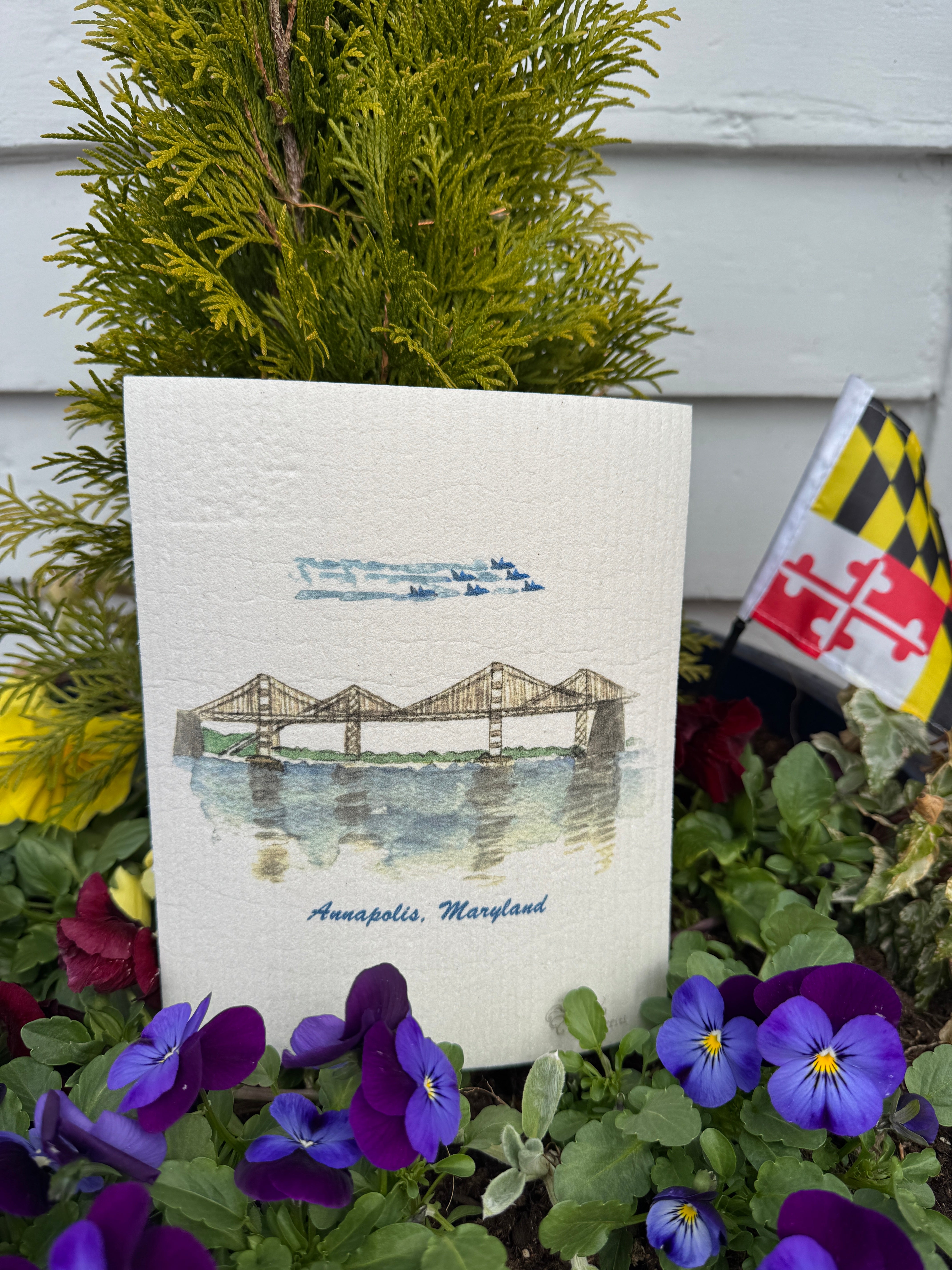 The perfect souvenir or gift for a local, these watercolor style tea towels and Swedish dish towels feature the famous Bay Bridge with the one and only Blue Angles flying over.