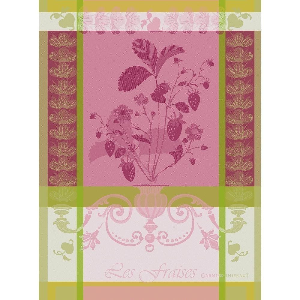 Garnier-Thiebaut's Tea Towel displays a trailing urn overflowing with ripe strawberries, artfully presented in a soft blush pink and citron green color scheme.