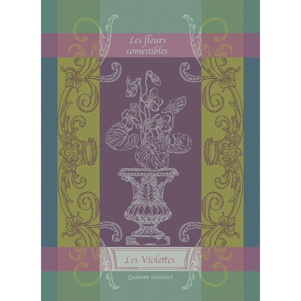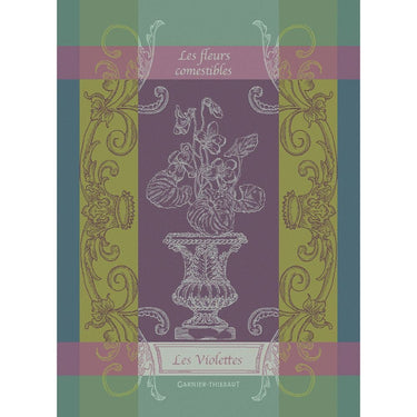 Les Fleurs Comestibles “The Edible Flowers” kitchen towels boast a traditional garden urn design with violets in shades of pale violet purple, blue, green, and muted citron.