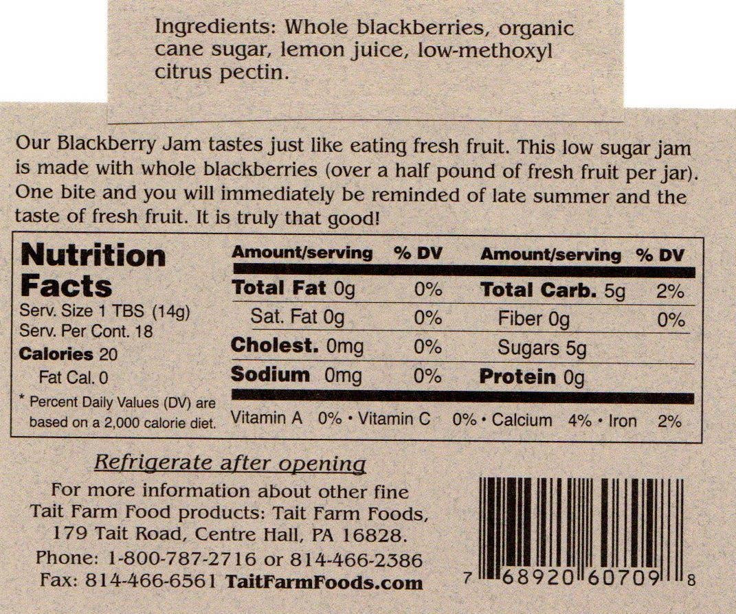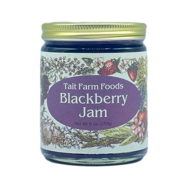 A Tait Farm Favorite! The Blackberry Jam tastes just like eating fresh fruit. This low sugar jam is made with whole blackberries (over half a pound of fresh fruit per jar). One bite, and you will immediately be reminded of summertime and the taste of fresh picked blackberries.