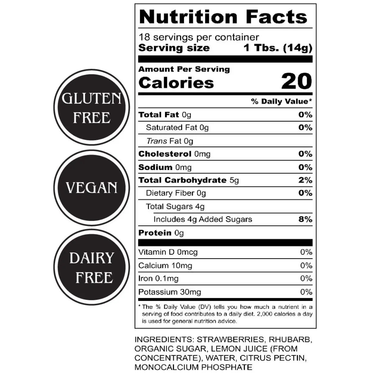 The Strawberry Rhubarb Conserve tastes just like eating fresh strawberry rhubarb pie. This low sugar jam is a perfect balance between sweet and tart, and is made with more than half a pound of fresh fruit per jar. One bite, and you will immediately be reminded of summertime and the taste of fresh picked strawberries cooked with rhubarb.