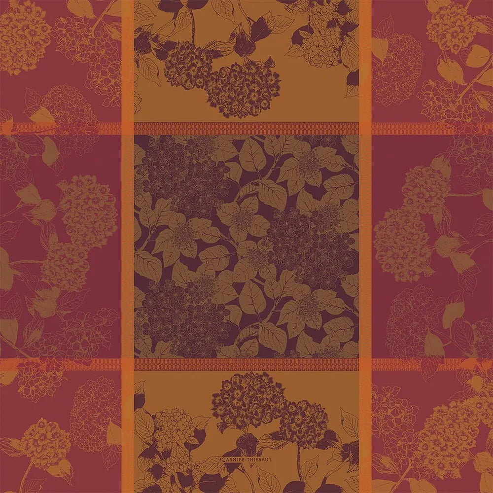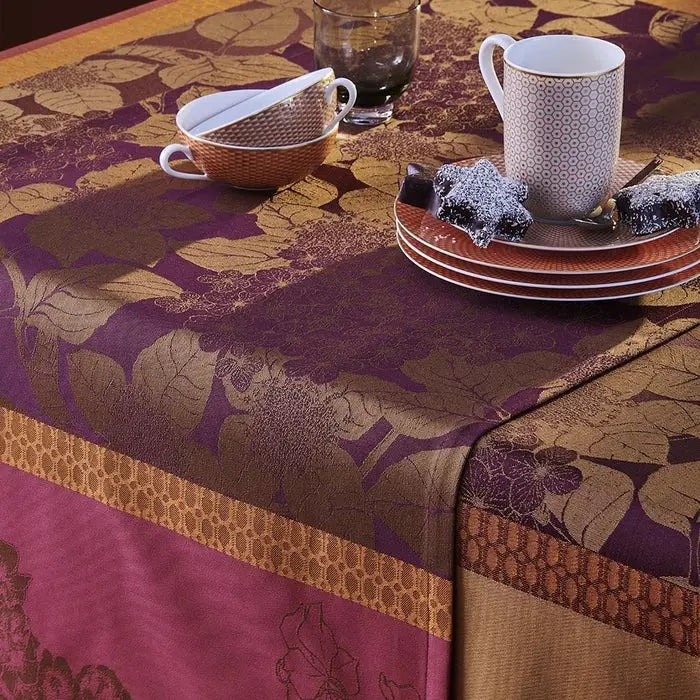 Garnier-Thiebaut's Hortensias Rouille Jacquard Tablecloth displays an expansive Hydrangea design in burgundy, rust, plum, and gold. We’re envisioning this tablecloth dressed with brass candlesticks and tapers in plum, gold, and platinum with seasonal greens.