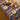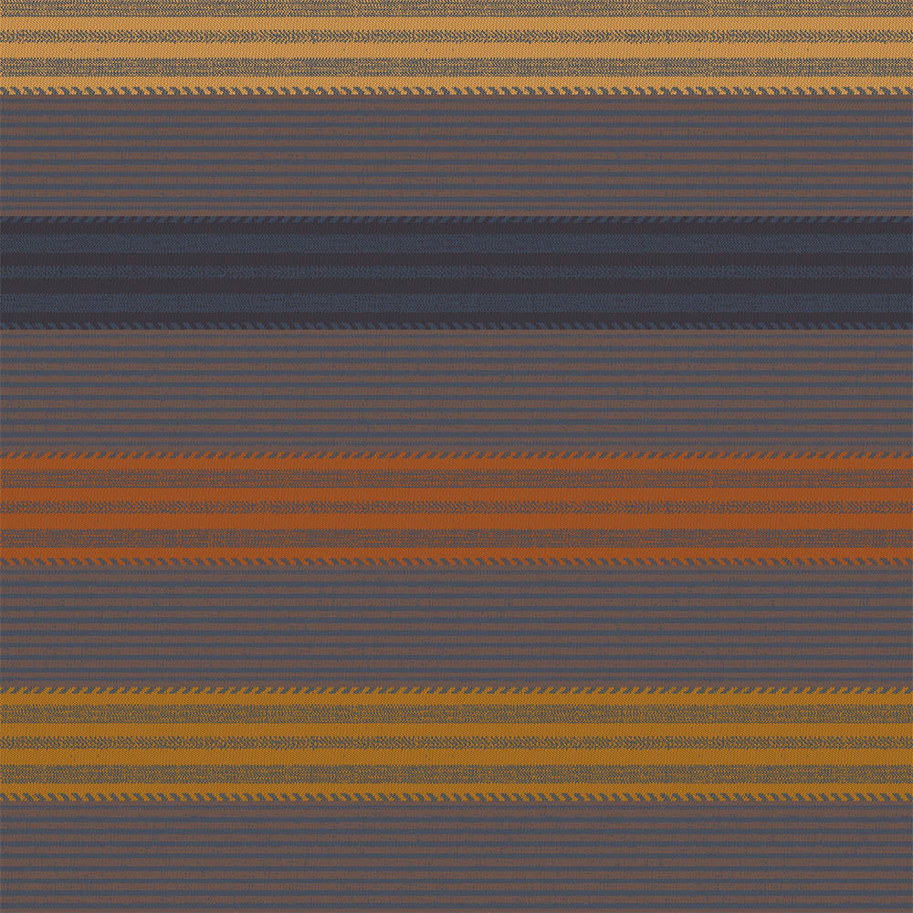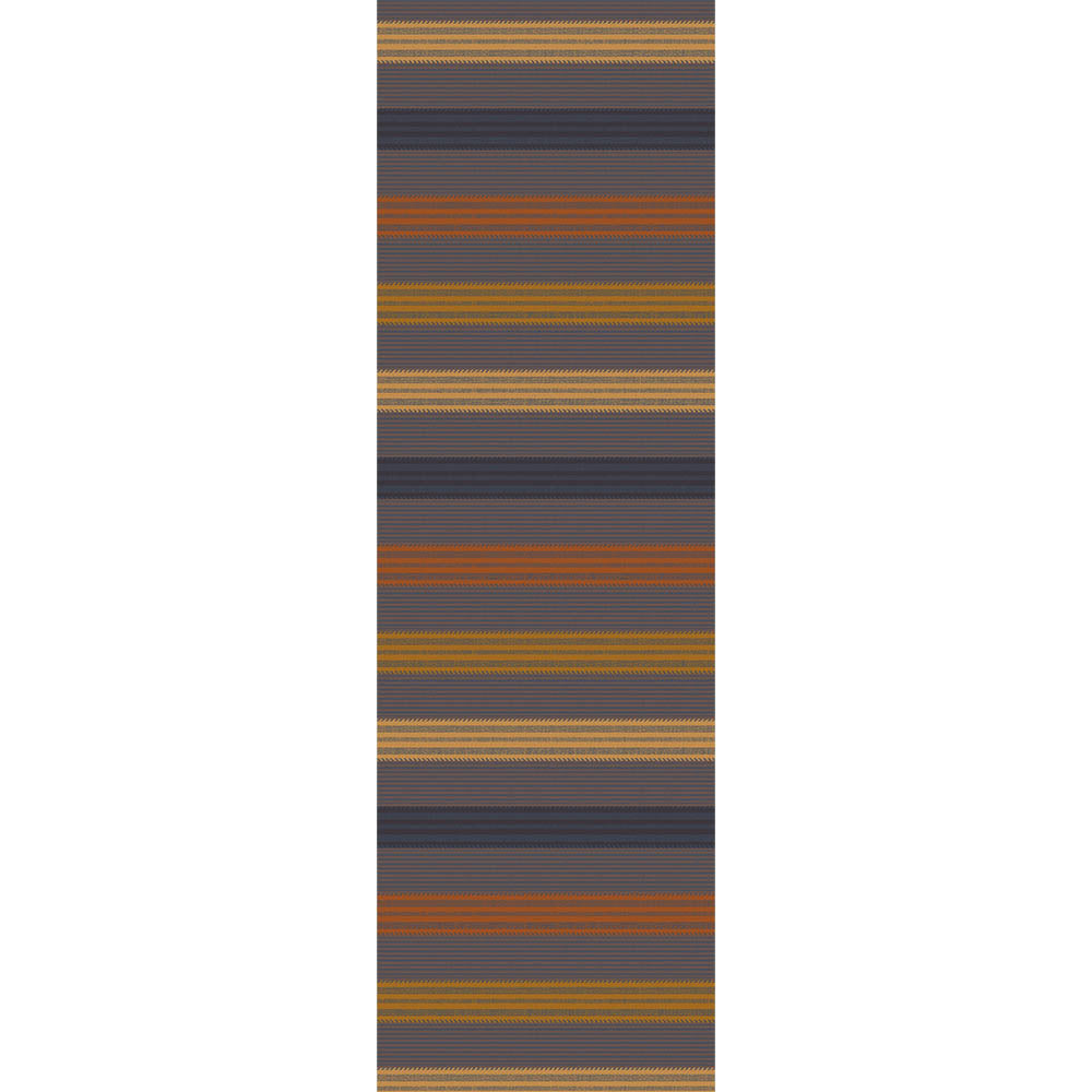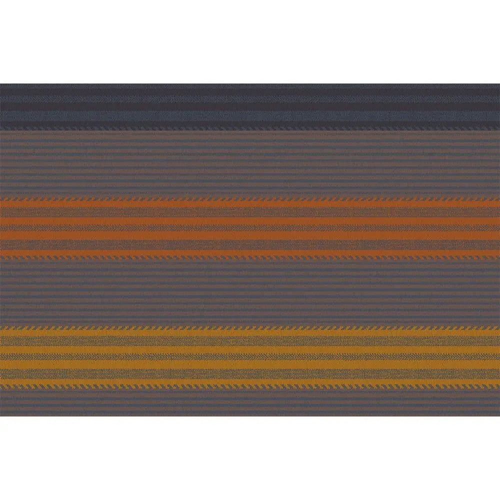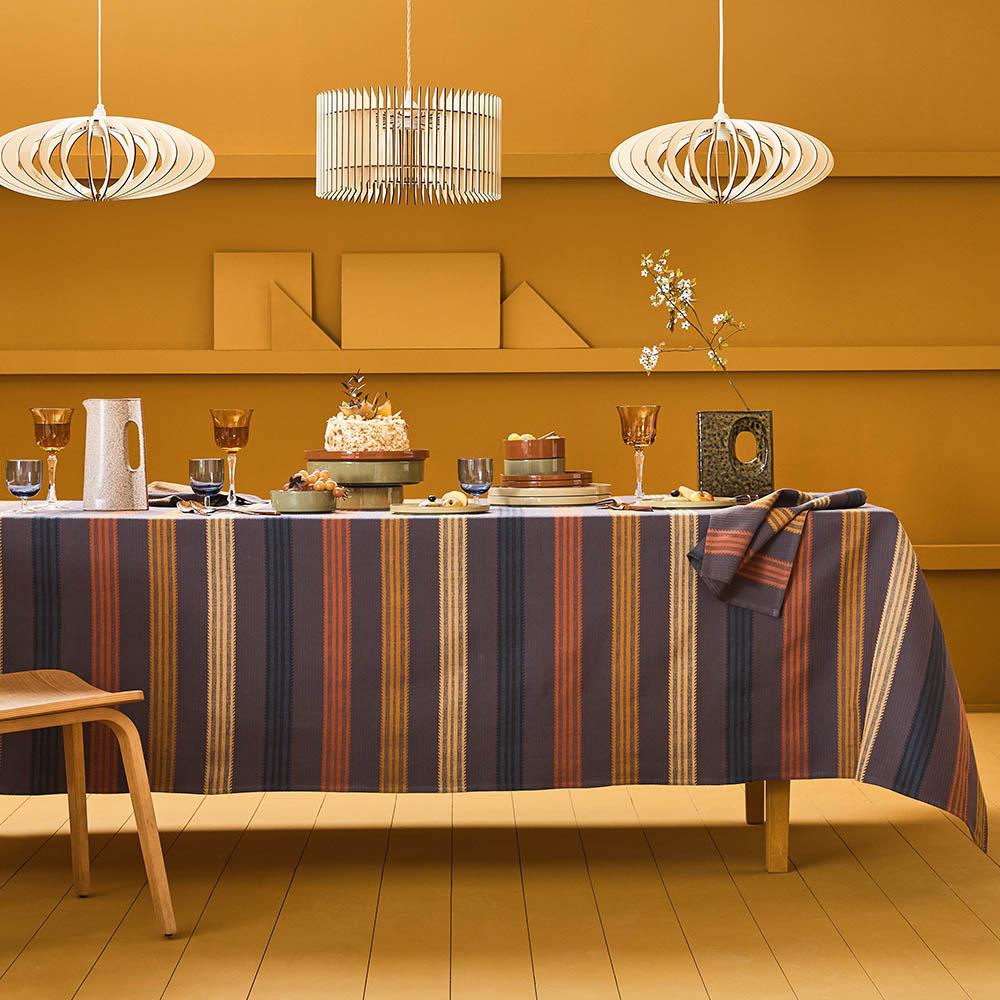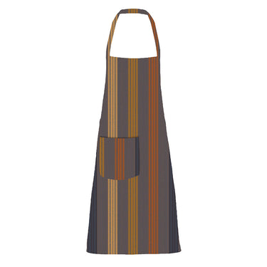 French table linens and aprons feature warm hues of amber, orange, grey and plum. Their vertical stripes form a contemporary pattern where colors merge smoothly, offering a refined and modern aesthetic.