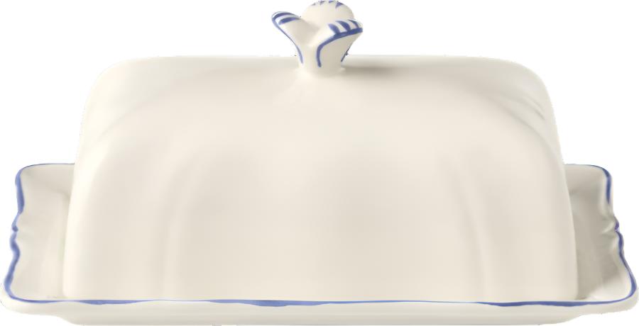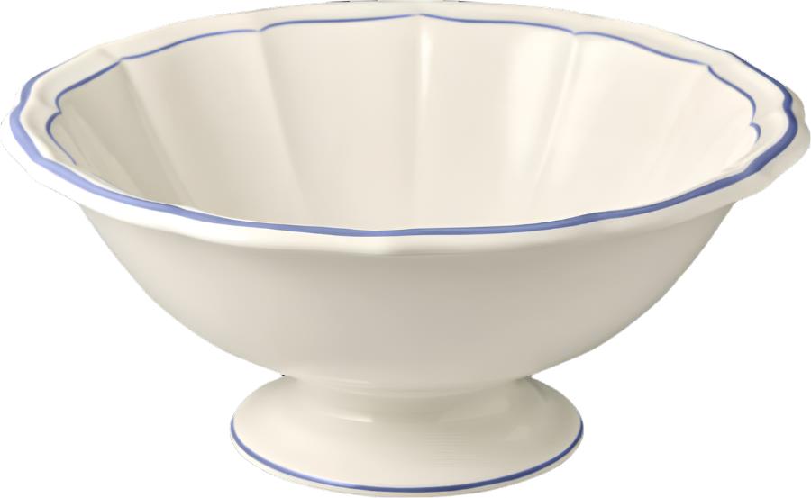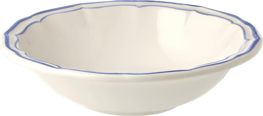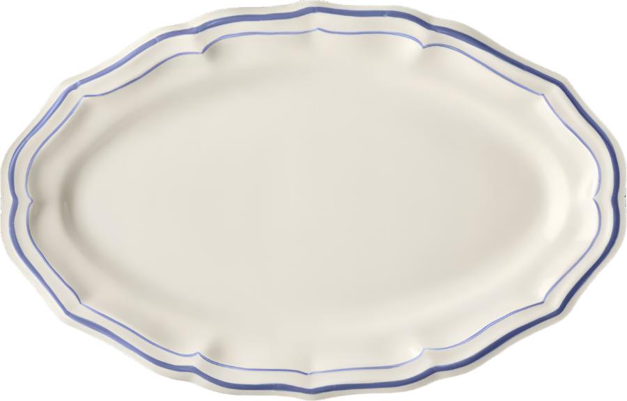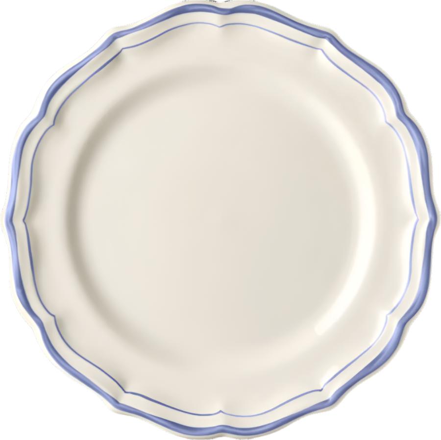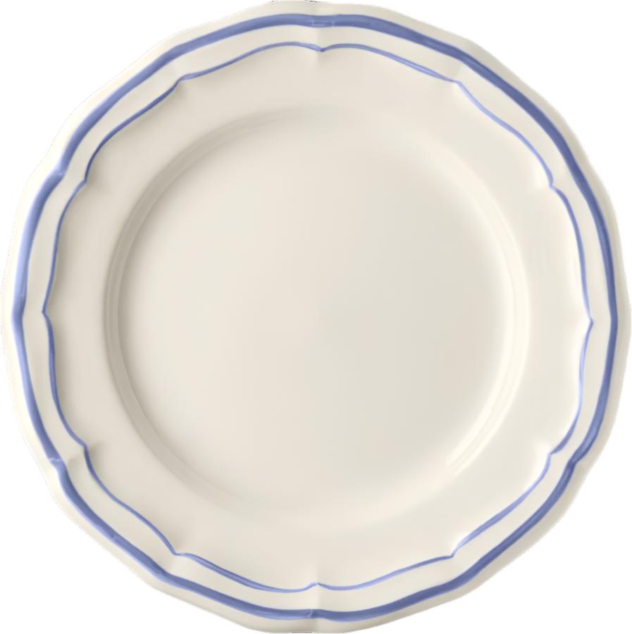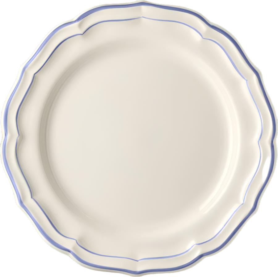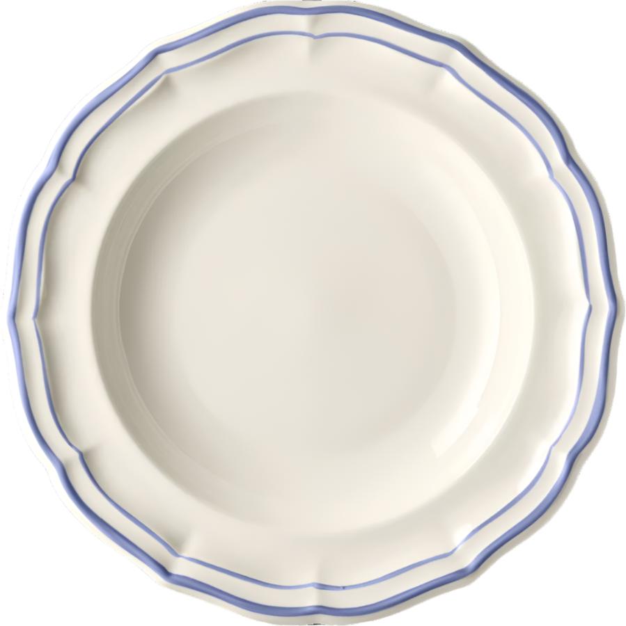 The Filet collection by Gien evokes an everyday elegance with delicate brush strokes hand-drawn on scalloped trim. In this variation, a touch of elegant blue contours each shell-shaped piece.
