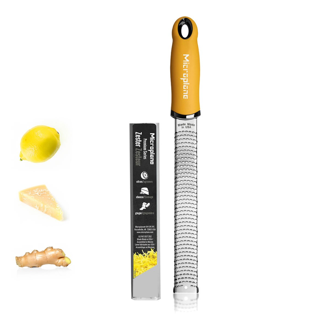 The Microplane Premium Series Zester & Grater Black has moved from the workshop to the kitchen. The iconic long, narrow rasp-style design is made of a surgical grade stainless steel blade with a comfortable soft-touch handle and non-scratch end tabs to grate even the hardest Parmesan Reggiano cheese. Hold the lemon in one hand and the Zester with the side up as if it were the neck of a violin. The zest collects in the upper channel with lacy fine shavings of zest--no more grated knuckles!
