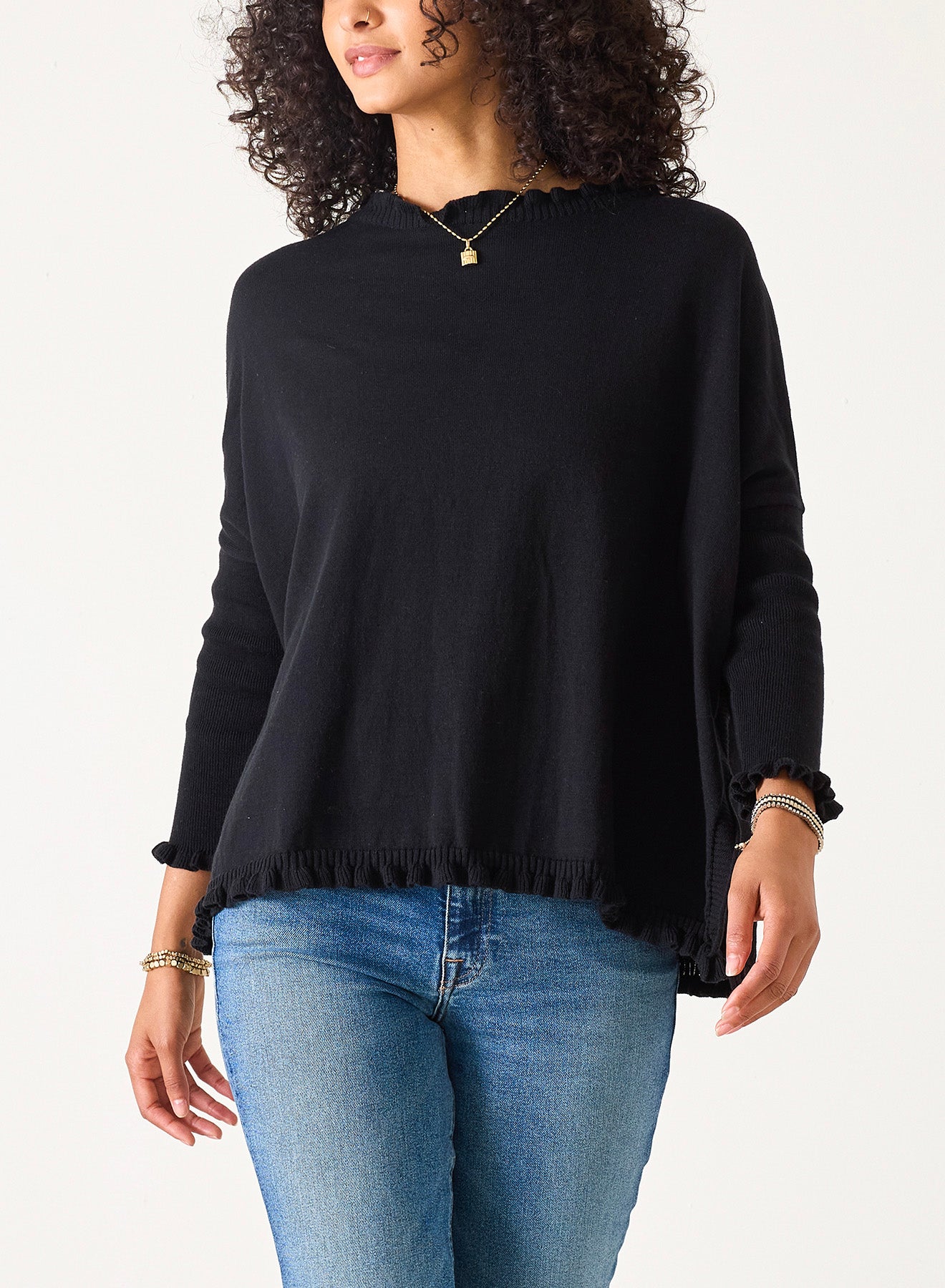 The Catalina Ruffley Sweater Collection elevates our classic design with elegant ruffle detailing at the wrists, neckline, and waistline. This versatile piece transitions seamlessly from casual outings to leisure moments with its sophisticated yet understated aesthetic. The signature split sides and billowy silhouette provide unrestricted movement, while the precisely positioned crewneck and sculpted shoulders maintain a polished structure. Whether worn as a standalone statement or layered, this year-round essential delivers both comfort and refinement for the discerning wearer.