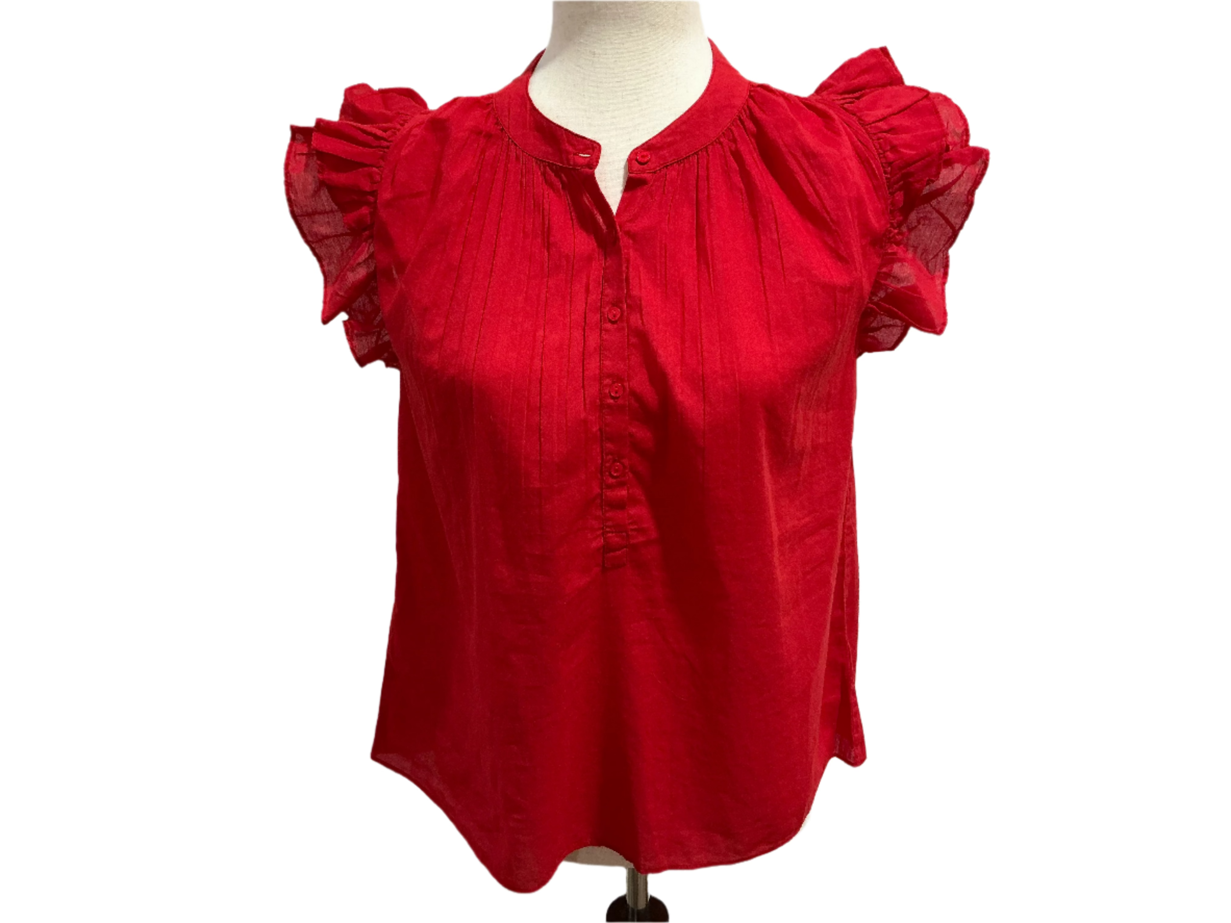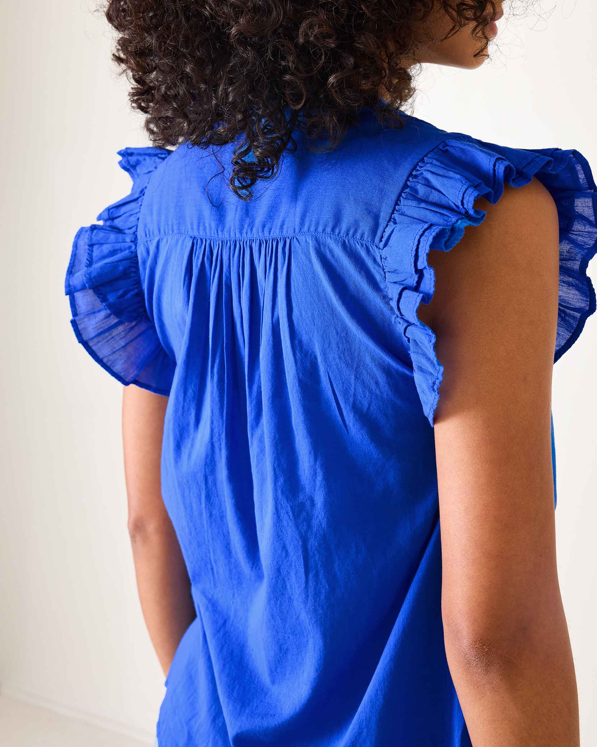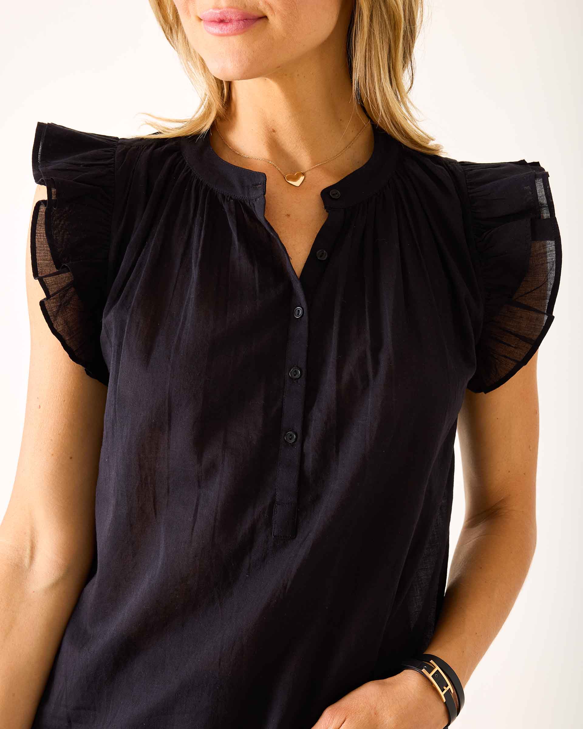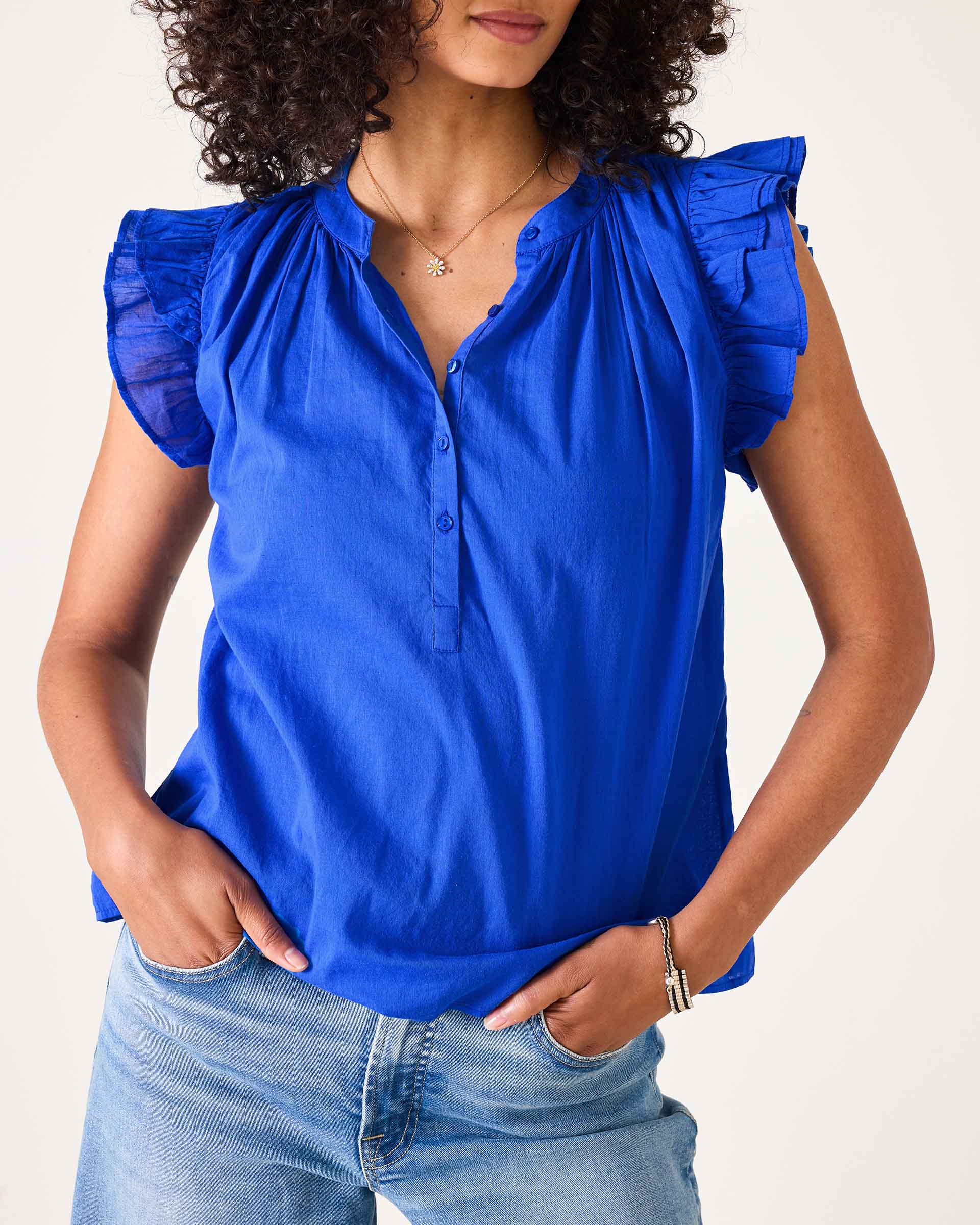 Getting ready is simple when you have pieces like the Flutter Sleeve Top filled with precious details. A femme ruffle trimmed flutter sleeve meets with a gathered high neckline and chic quarter placket with buttons. Lightweight and flattering cut, easily elevates any outfit and made of 100% cotton soft texture.