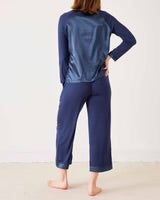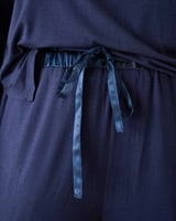 Set sail for our best night of sleep in the Satin Sailor Modal pajama set. That's right, a new version of our classic satin set in a buttery soft modal fabric. The top is modal with a pop of satin on the backside for sleek movement and the wide leg pant with elastic waist keeps comfort top priority.