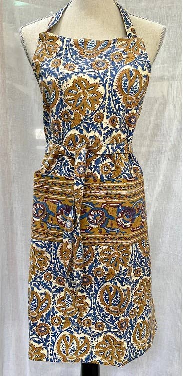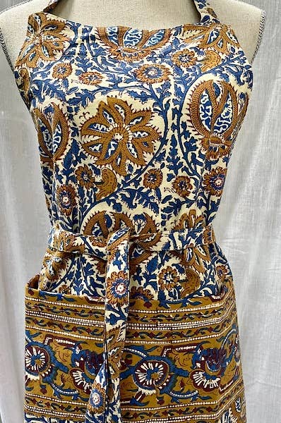 Maintain a stylish and polished appearance with the Pumpkin Flower Blockprint Apron, crafted from hand-printed cotton canvas. Featuring a button hole neck strap adjustment and a waist tie, this apron offers a comfortable and customized fit. Keep essential items, such as thermometers and kitchen towels, easily accessible in the front pocket.