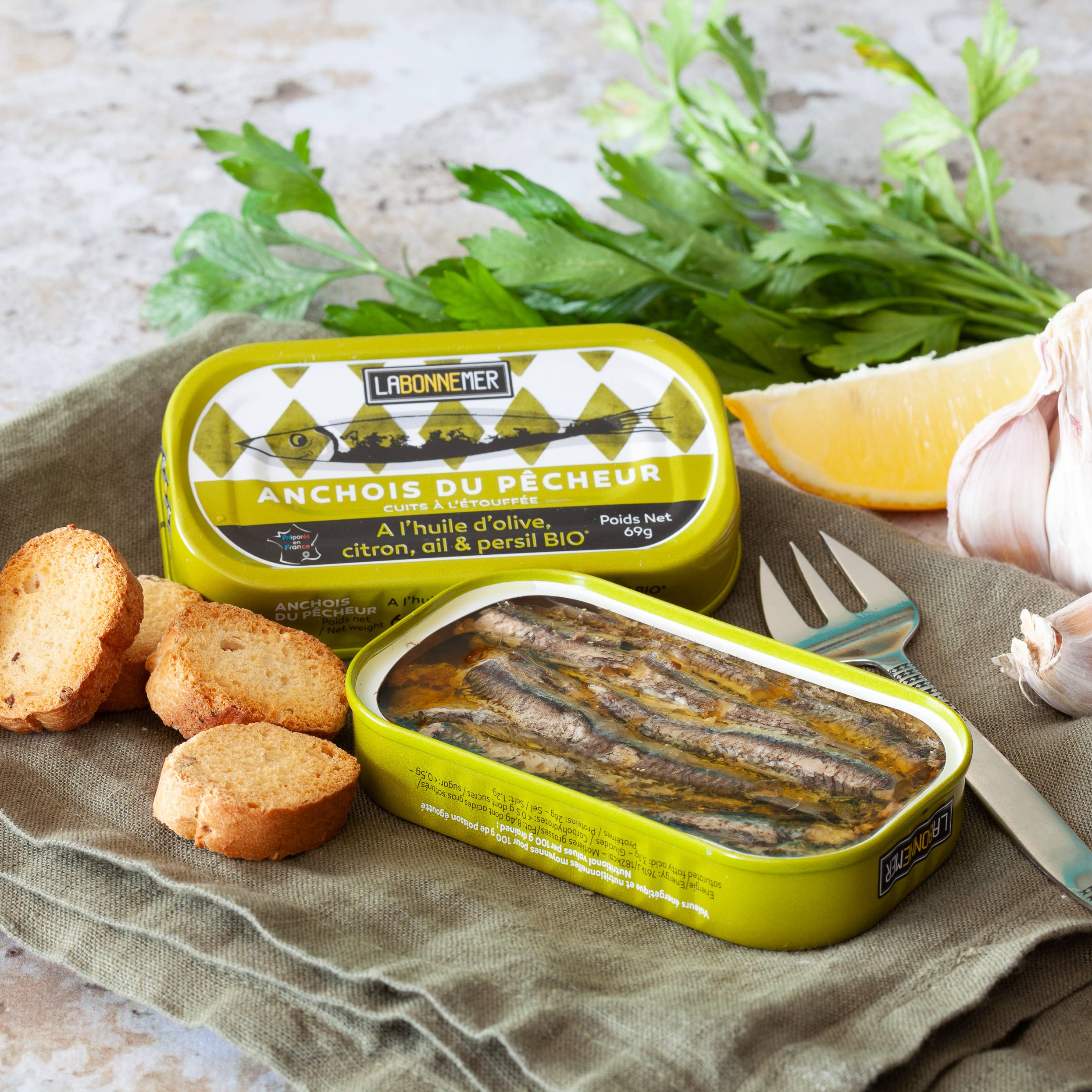 Net weight 69 g Additional indication Fishing area: Mediterranean Sea. List of ingredients Wild anchovy (Engraulis encrasicolus) 70%, extra virgin olive oil*, lemon* 2%, garlic* 1.5%, salt, parsley* 0.5%. * 29.2% of agricultural ingredients come from organic farming. Certified by Bureau Veritas Certification France — FR-BIO-10. DDM 5 years Made by hand Yes Cruelty Free yes