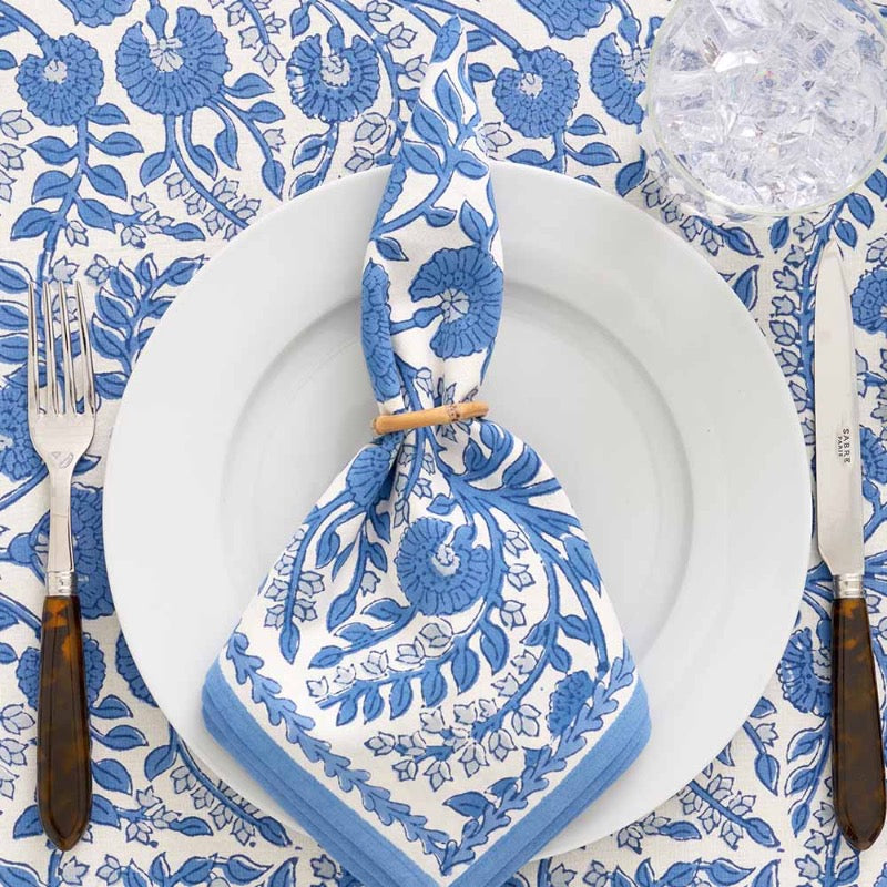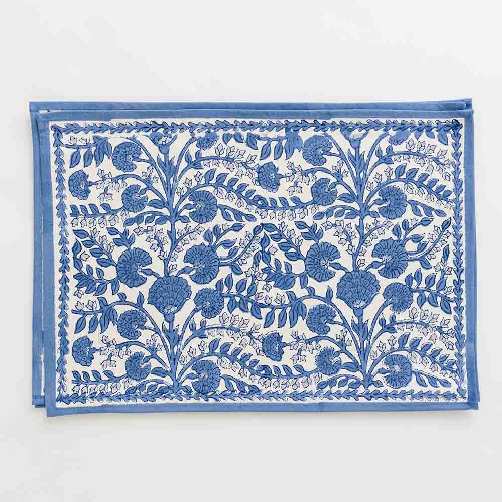 This cornflower blue and white floral designed placemat set is classically ethnic and modern at the same time. Floral vines run across this hand painted design, filling up your table with cheerful blooms. Canvas placemats are perfect for everyday and entertaining in style. Matching napkins complete the set.