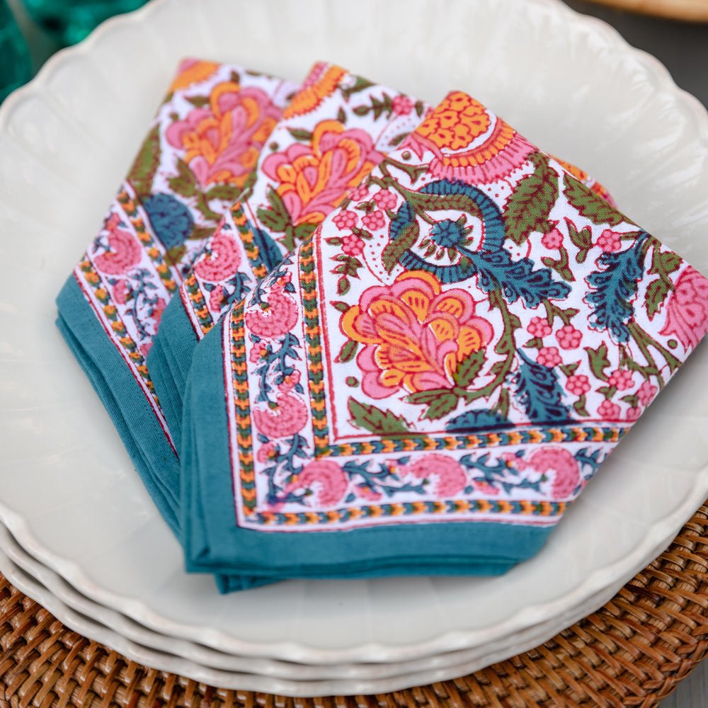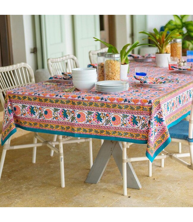 Refreshing spring blossoms! Cheer up the family table with this beautiful jewel toned floral block printed tablecloth featuring teals, pinks and oranges. Our blossoms collection is the perfect way to refresh your table for spring and summer--mix and match for an effortless look that will brighten up your home!