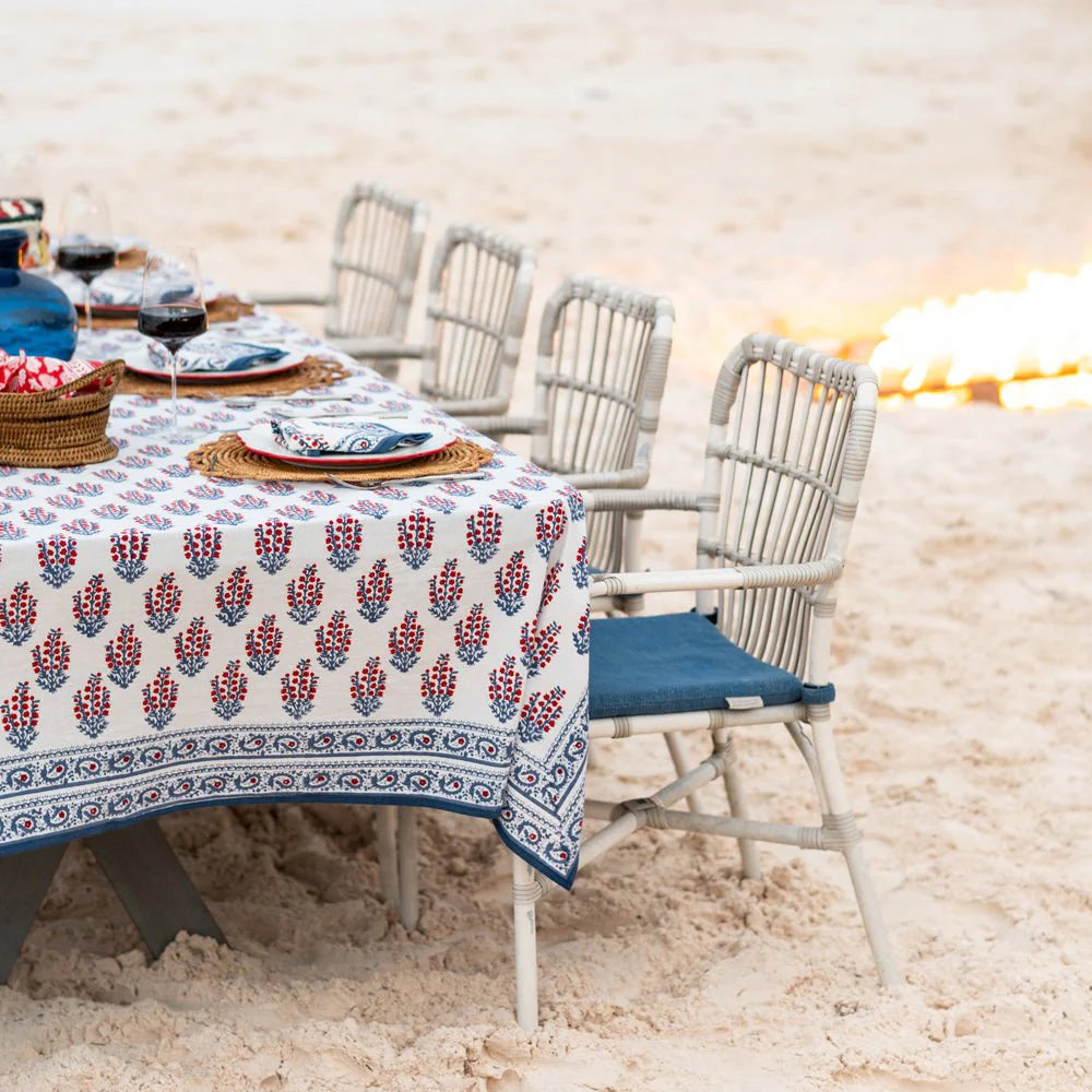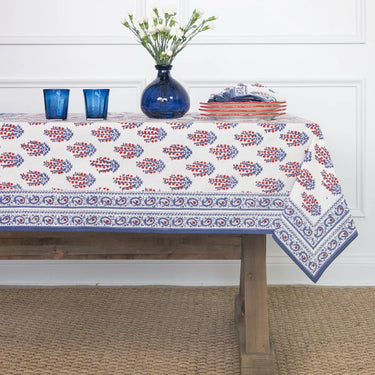 Experience the cultural charm of Central India's Sagar District in your dining room with our Sagar Red & Blue Tablecloth. This premium fabric tablecloth showcases a hand block printed botanical design in vibrant red and soothing blue tones, perfectly reflecting the beauty of the region. Not only does it add elegance to any table setting, but it also offers durability and easy maintenance, making it an ideal choice for any occasion.