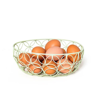 This egg shaped egg basket is made of pistachio green powder coated steel wire and is a cute way of storing eggs -it can hold up to at least twelve eggs, garlic, or onions. Make life colourful!