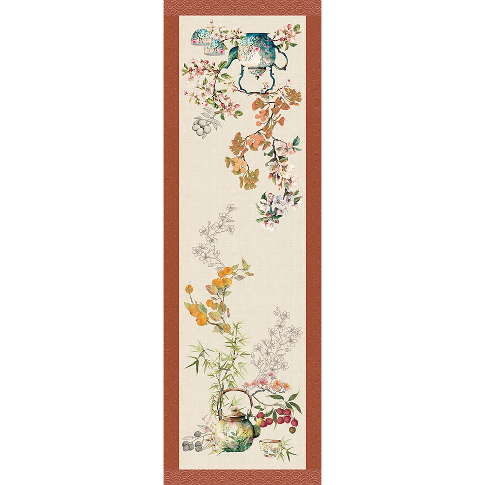 Theieres Rouille Collection showcases rich hues of red, golden yellow, green, and blue. This table linen is adorned with an Asian-inspired teapot design, brimming with blossoms and branches.