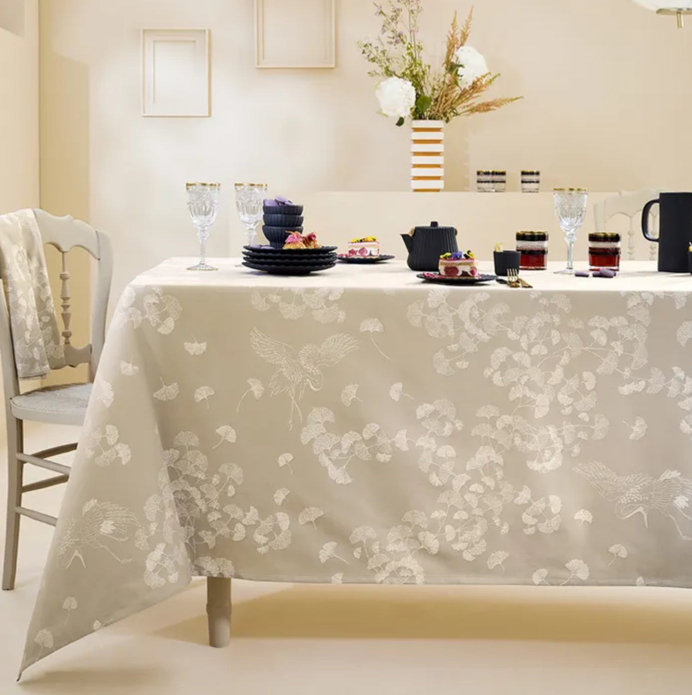 Create an elegant, airy table setting with the Mille Ginkos Naturel Tablecloth by Garnier Thiebaut. Featuring delicate ginkgo flowers flowing through the light air in soft shades of cream and Grey, this jacquard-woven design is crafted in France from extra-long staple cotton. Designed by our in-house artisans, it combines timeless beauty with lasting durability for every occasion.