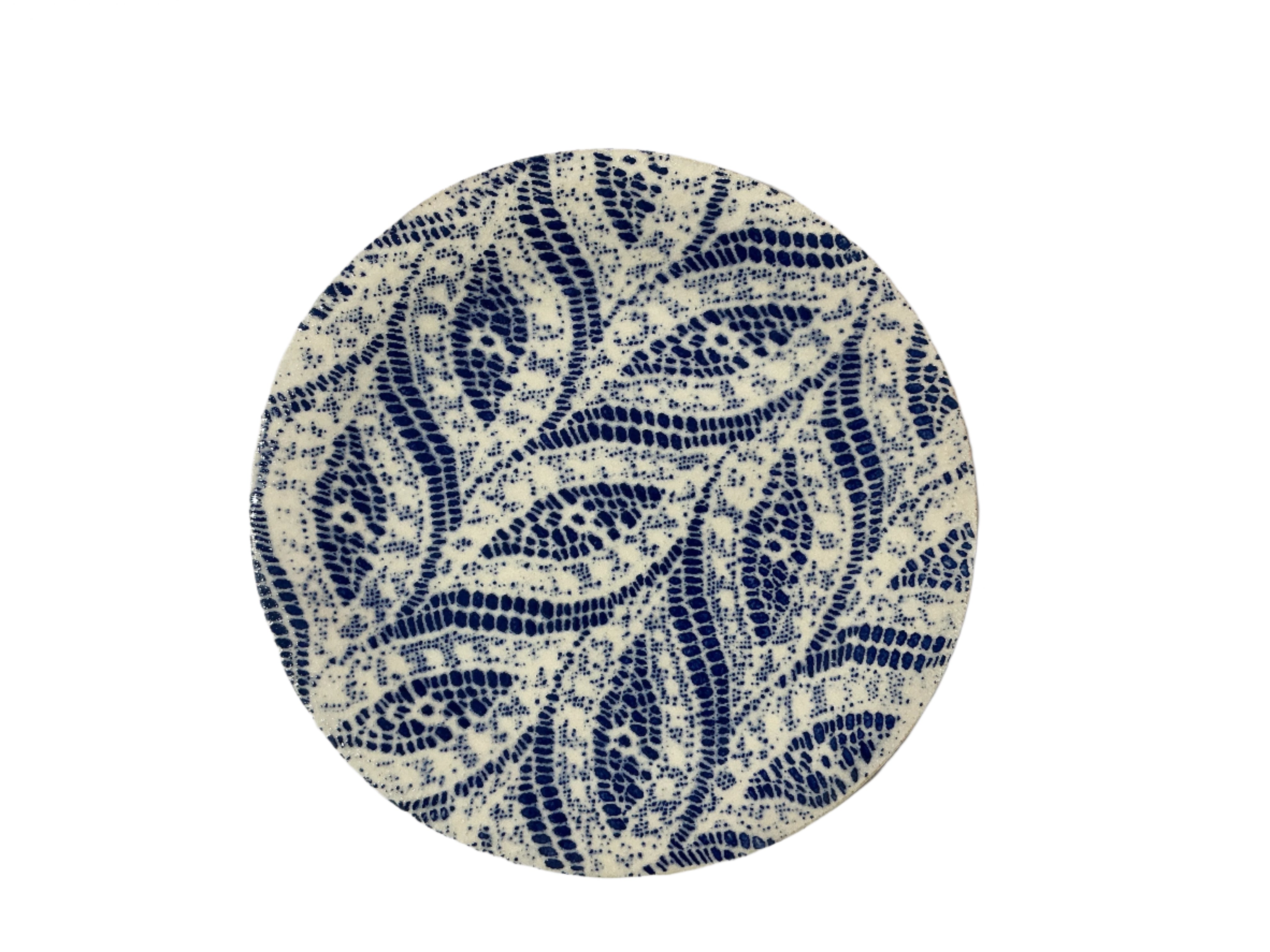 Patterns are created by painting through textiles and lace using liquid porcelain to produce a distinctive "one of a kind" result. The base of warm, natural stoneware juxtaposed with vibrantly colored and patterned porcelain surfaces achieves the casual yet sophisticated look that has become her signature in both dinnerware and accessories.
