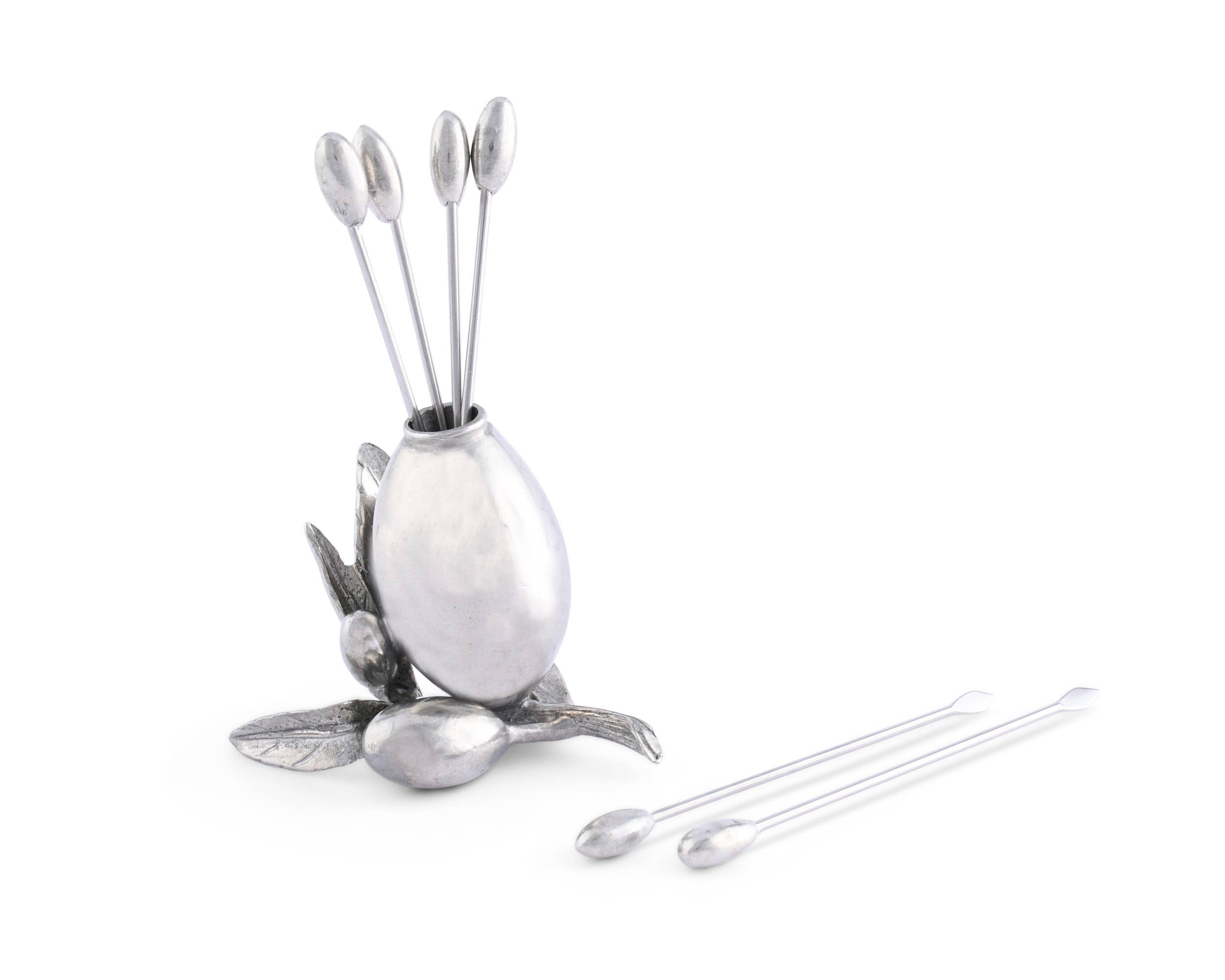 Bring a bit of Mediterranean art and joie de vivre to your cheese service with our Olive Cheese Pick Set. Hand-cast in luxury pewter as a miniature still life of a fruit laden Olive twig, the holder has six picks, each topped with a tiny pewter olive.