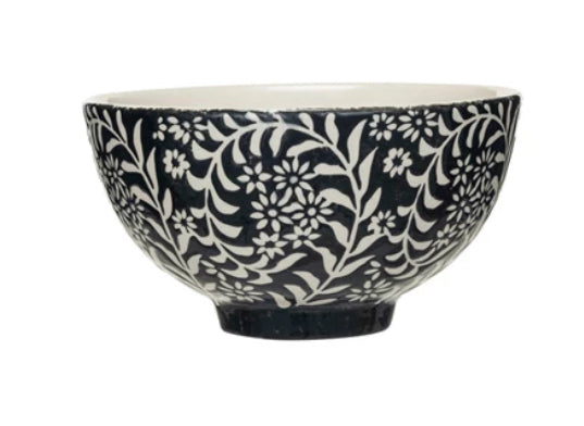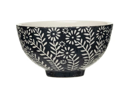 This hand-painted stoneware bowl measures 4-3/4" diameter and 2-1/4" height, featuring wax relief botanical designs in two color options and two styles.